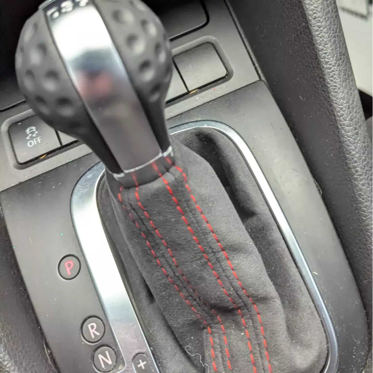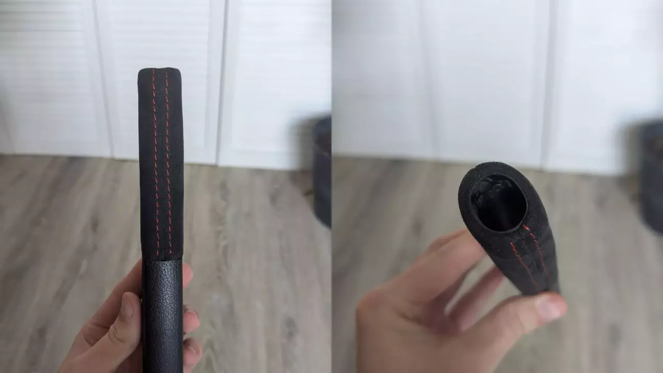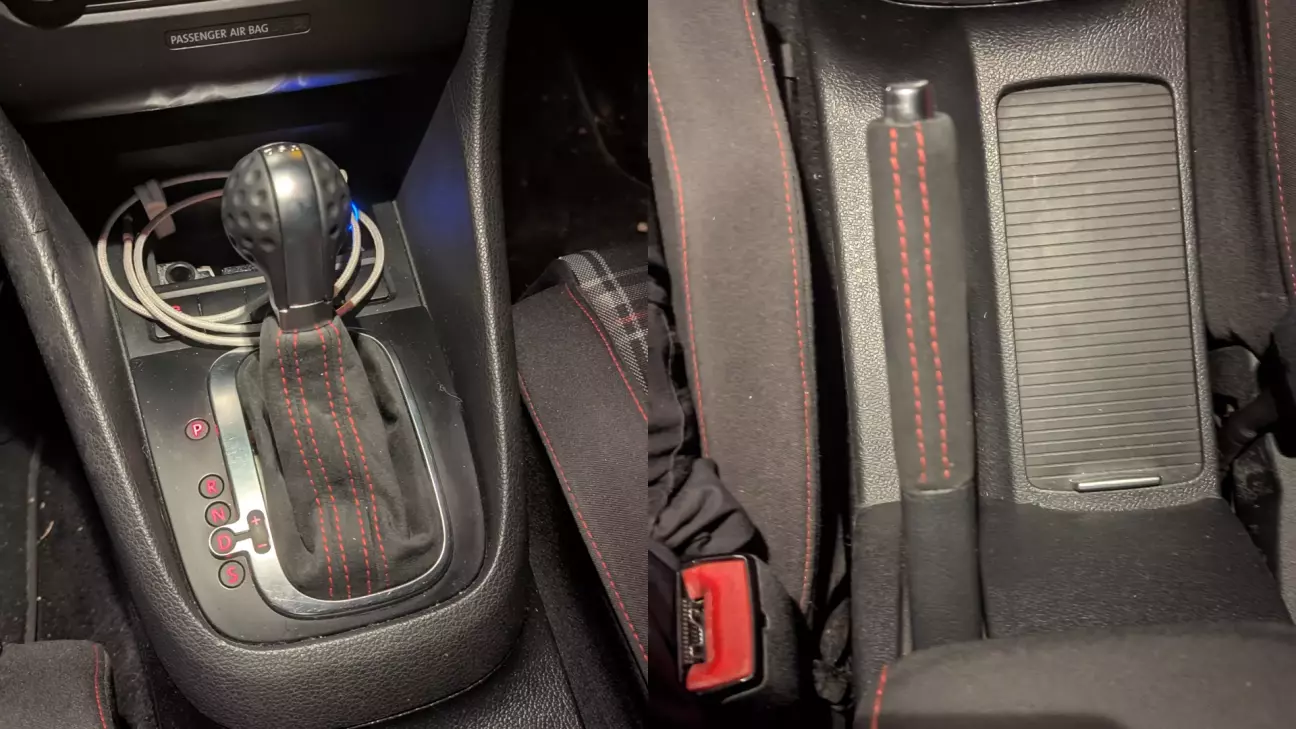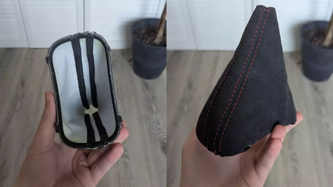 Тому я вирішив перешити і чохол коробки передач, і чохол стоянкового гальма теж в алькантару. Демонтаж був не з приємних. Ручник знімається вперед, без очевидної логіки, просто одна кліпса на звороті. Чохол КПП ще складніший. Пластик затиснутий металевою кліпсою, а в процесі з’ясувалось, що рамка була зламана ще до мене. Я про це не знав. Попри це, все вдалося зняти акуратно. Щоб таки зняти кноб, потрібно обережно витягнути чохол з основи. Далі вивернути його догори. Розігнути металеву кліпсу та просто стягнути догори. Далі потрібно зняти пластикову заглушку/тримач, і звільнити тканину чохла. Назад збирається в зворотному порядку, важливо дивитися на пластикові заглиблення, вони зроблені спеціально під шви, щоб все гарно лягало.