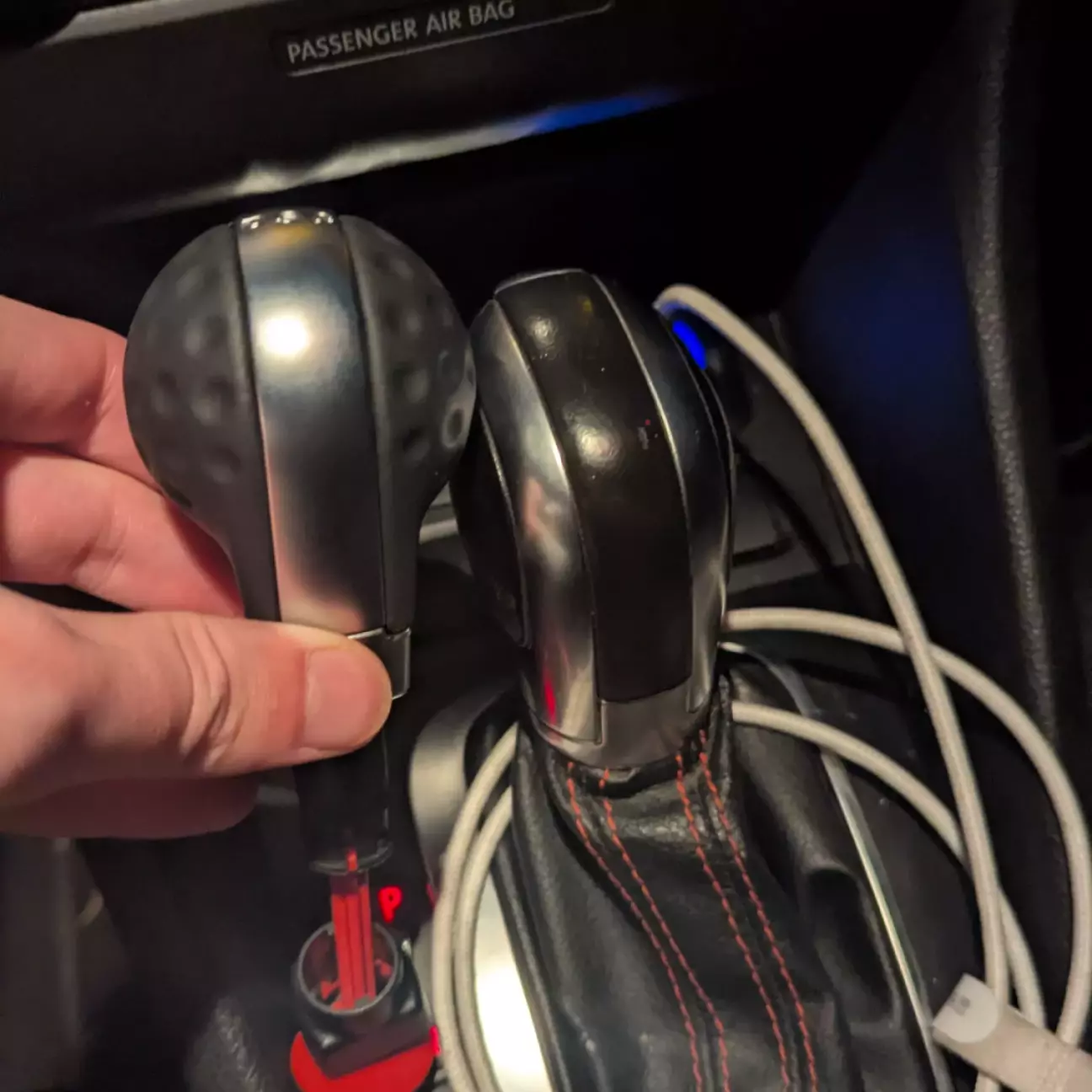 І тут стало очевидно, що з таким рулем решта салону почала виглядати втомлено. Чохол КПП і ручник вже були затерті, з мікротріщинами. Вони просто випадали з картинки. Хотілось, щоб все грало разом. Також знайшов собі нового кноба у вигляді кульки для гольфу, яку ставили в edition 35.