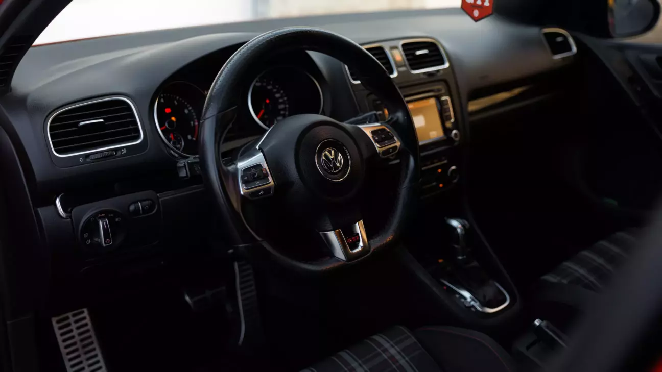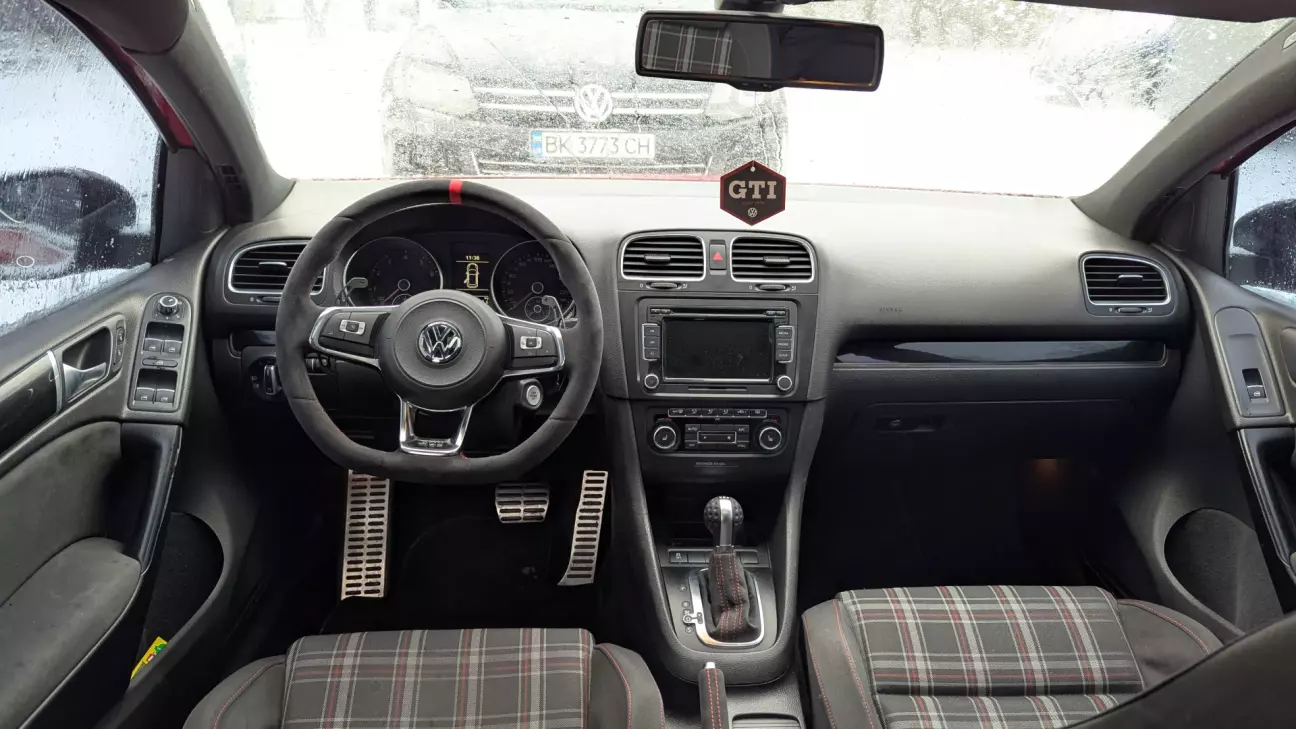 Це був руль від MQB Golf GTI. Порівняно зі стоковим PQ він відчувається трохи більшим по діаметру і трохи тоншим по ободу. Знизу підрізаний, але не агресивний. Більш елегантний. Якщо руль від MK6 GTI товстий, формений і такий м’язистий, то MQB-варіант виглядає легше, акуратніше. Дуже зайшла алюмінієва вставка з написом GTI. Вона реально робить вигляд.