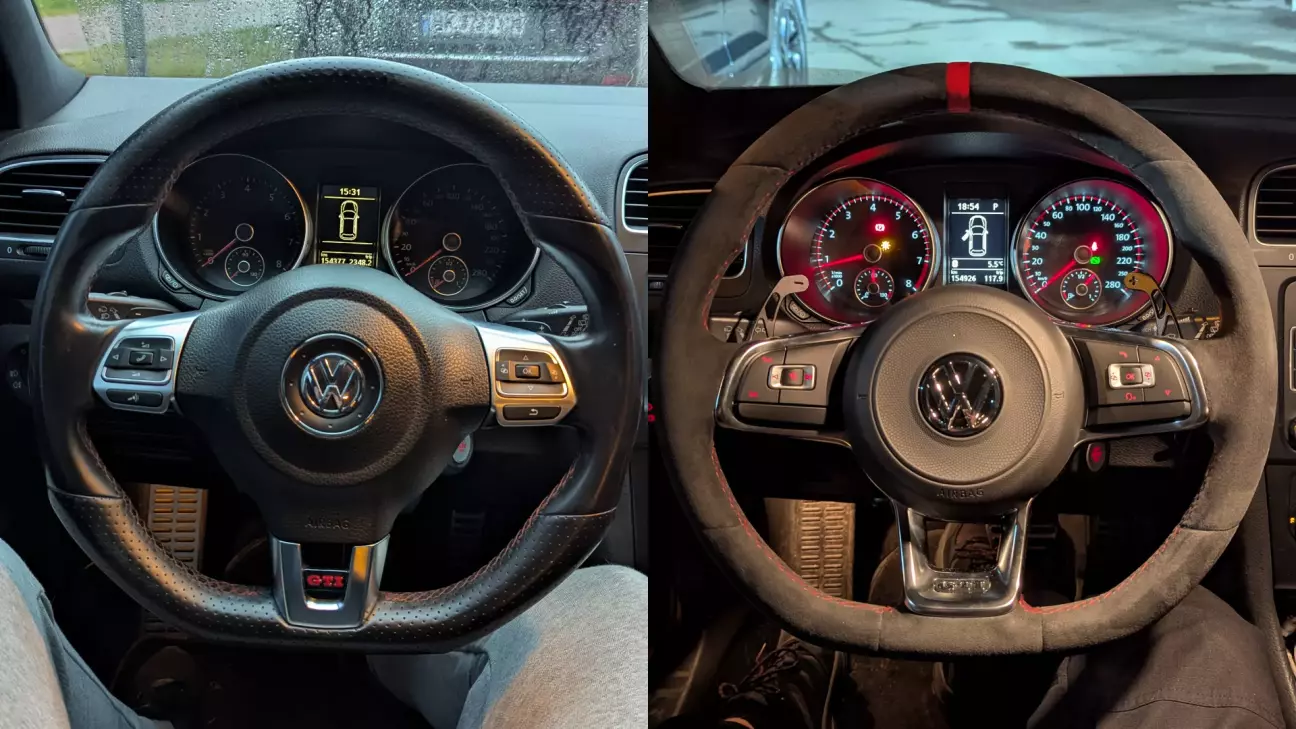 Руль я одразу хотів перешивати. Алькантара була свідомим вибором. Я бачив багато референсів і мені дуже подобається, як виглядають такі керма. До цього я ніколи не мав руля з алькантари і не знав, як вона поводиться в житті, але хотілось спробувати. Червона мітка по центру була логічним доповненням. Просто подобається цей спортивний акцент.