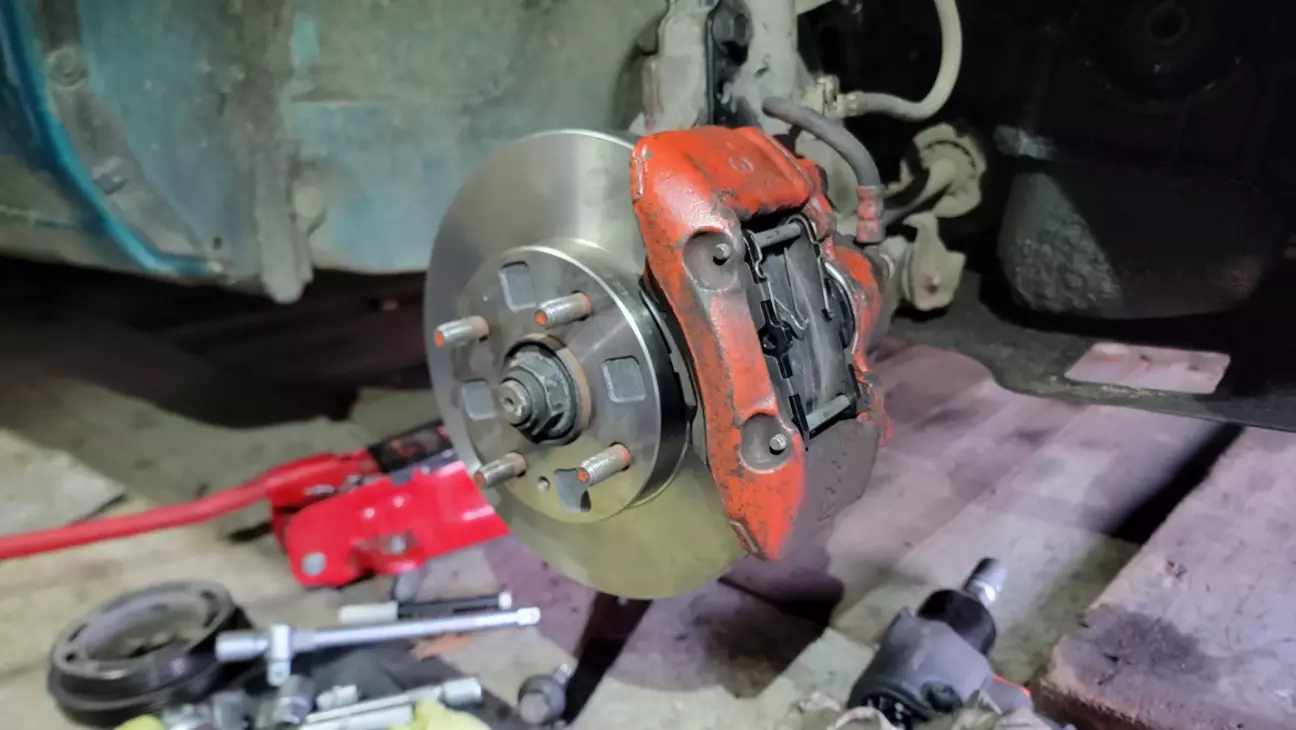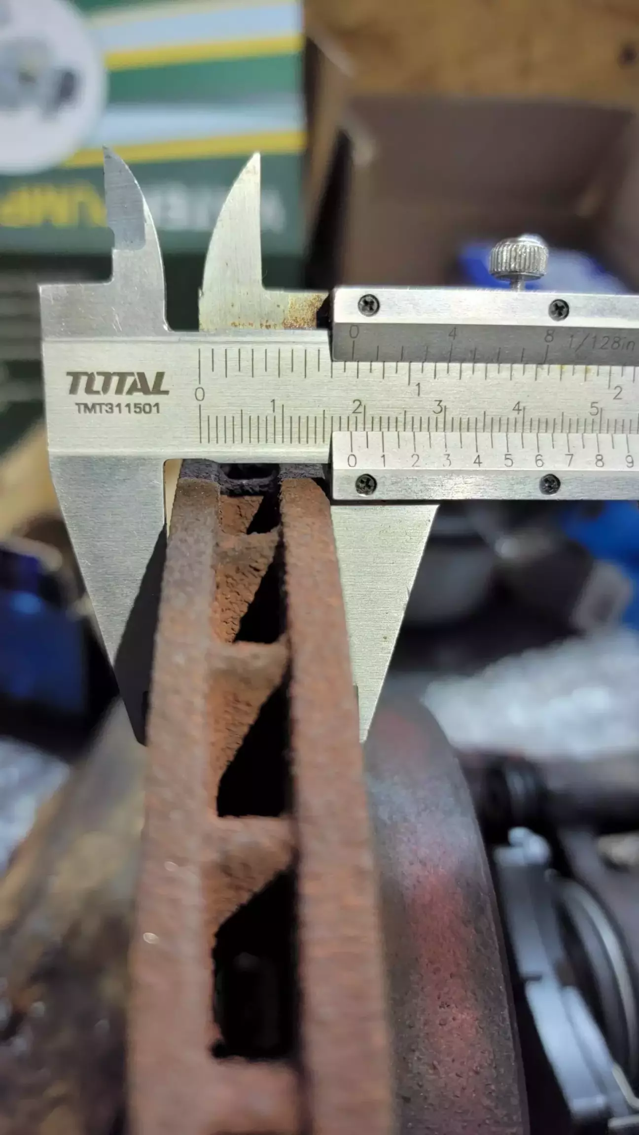 Почати я вирішив з нього, бо до нього найбільше було питань. Зняв я колесо, 2 болта які супорт кріпили до ступиці, і вхід системи, який був підключений через банджо-болт. Ще мене цікавив стан гальмівних дисків, після того як минулий власник казав що одного разу не зміг відгальмувати, типу диски перегрілись. І не прогадав! Знос був більше мінімума!
