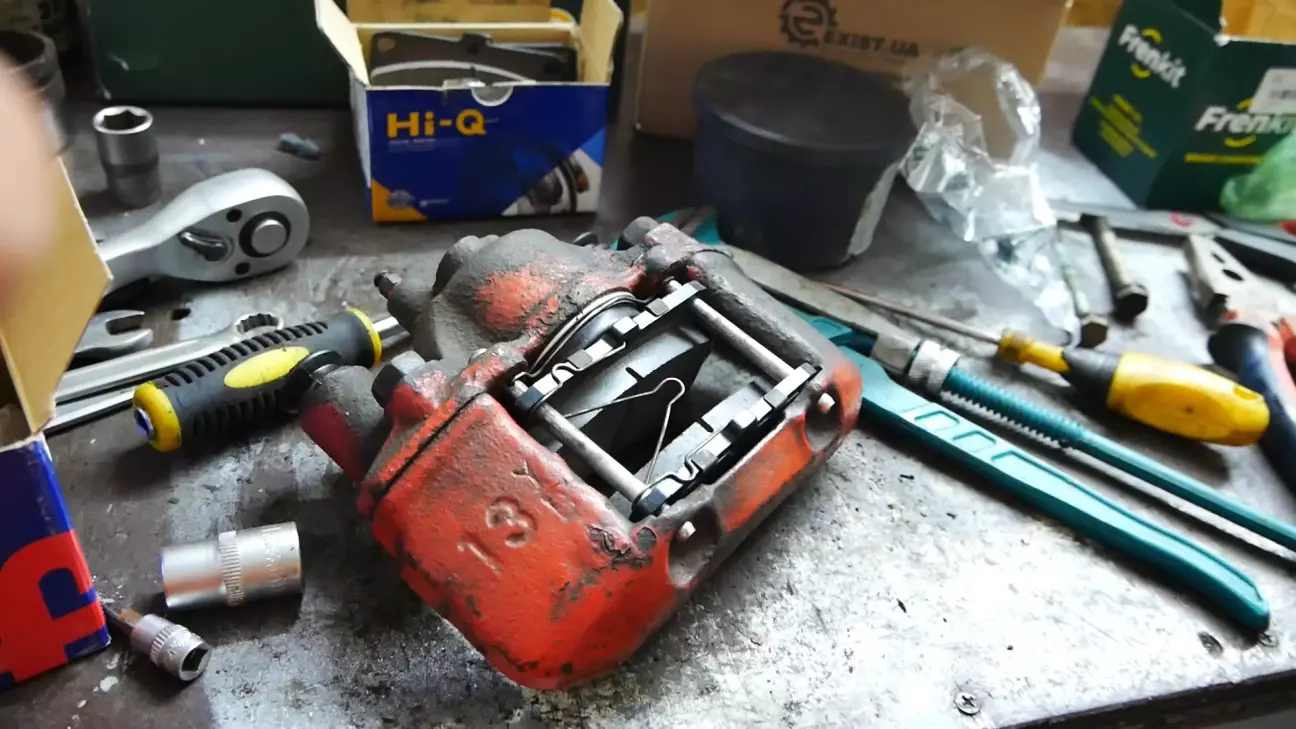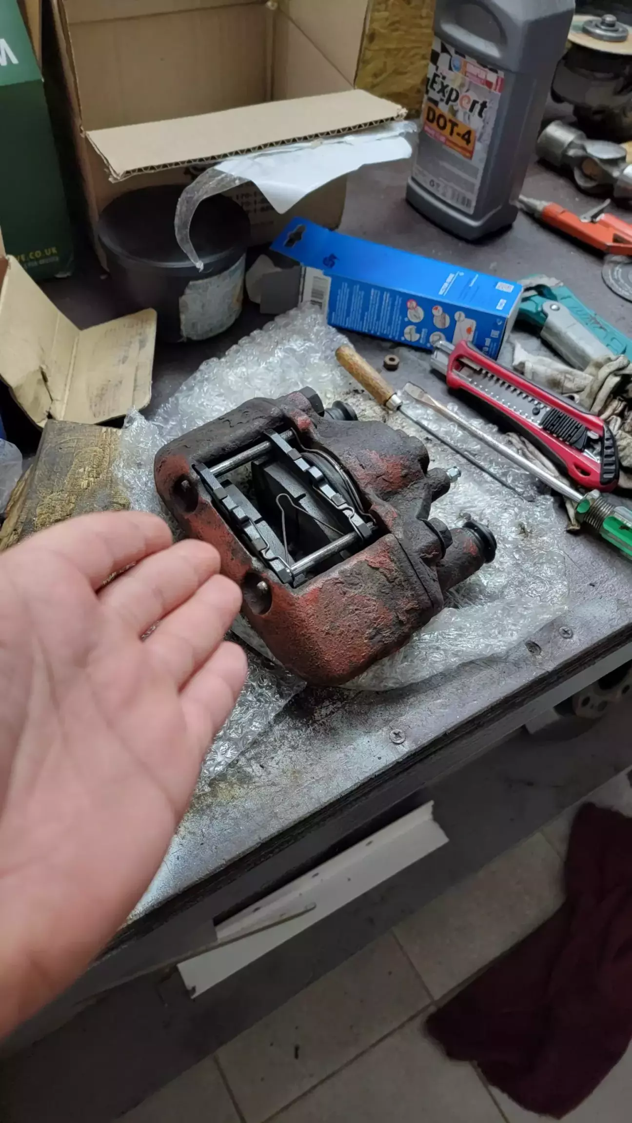 У принципі із цим супортом все було більш менш, того сильно я на цьому зупинятись не буду. Просто зняв його, перезібрав на комплектних запчастинах і ось він з новими колодками, поршнем та резиночками. Порень був у більш прийнятному стані, про те пильнички вже були порвані.