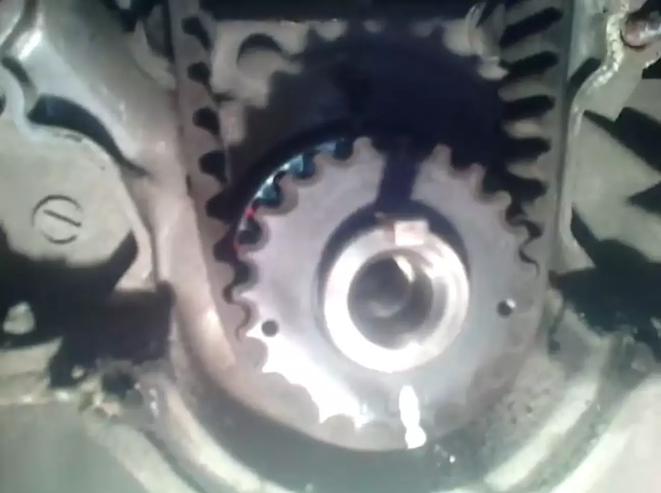 Але я трошки на перед заглянув, бо ми ж не відкрутили шківи колінчастого вала на генератор та ГПК! В принципі вони кріпляться на 4-х болтиках під 10-ту головку, але центральний болт кріпить проставку до якої прикручуються ці шківи, та захищає ремінь ГРМ на привідній шестерні. Бляха він мені і пнєвмою не давався, поки я ззовні це місце горілкою не погрів, і тоді я його зняв та побачив картину яку я надав вище.
