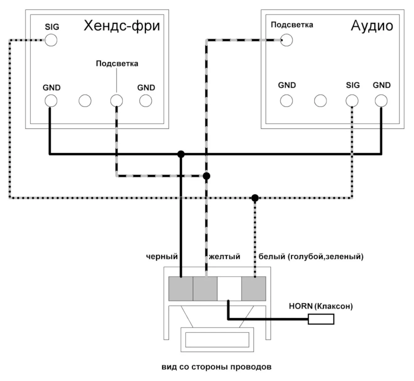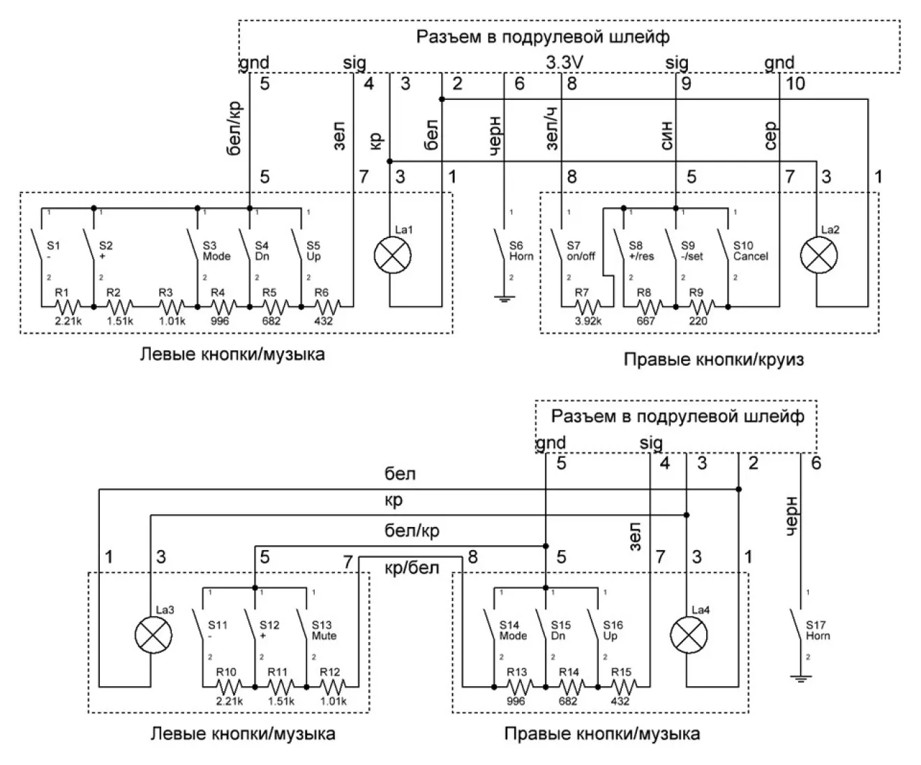 По найденной схеме переподключил провода, замкнув массы подсветки сигнала кнопок в один.