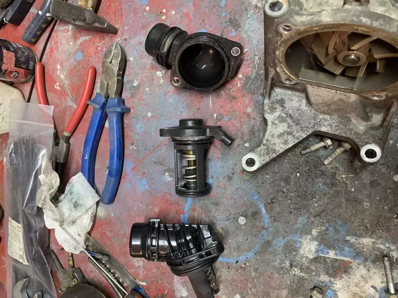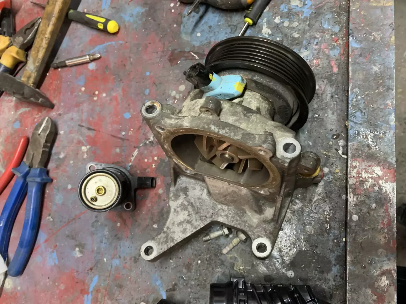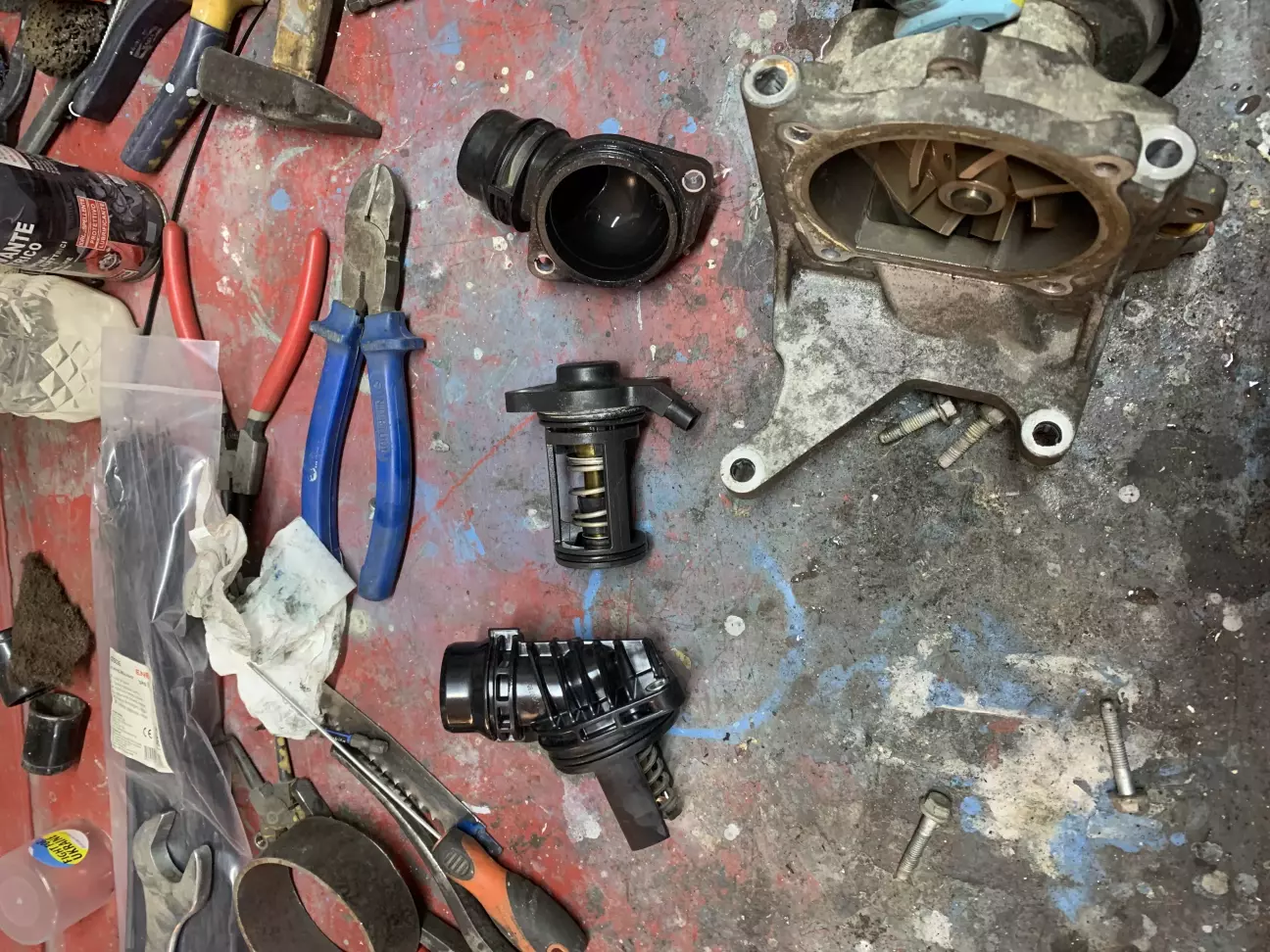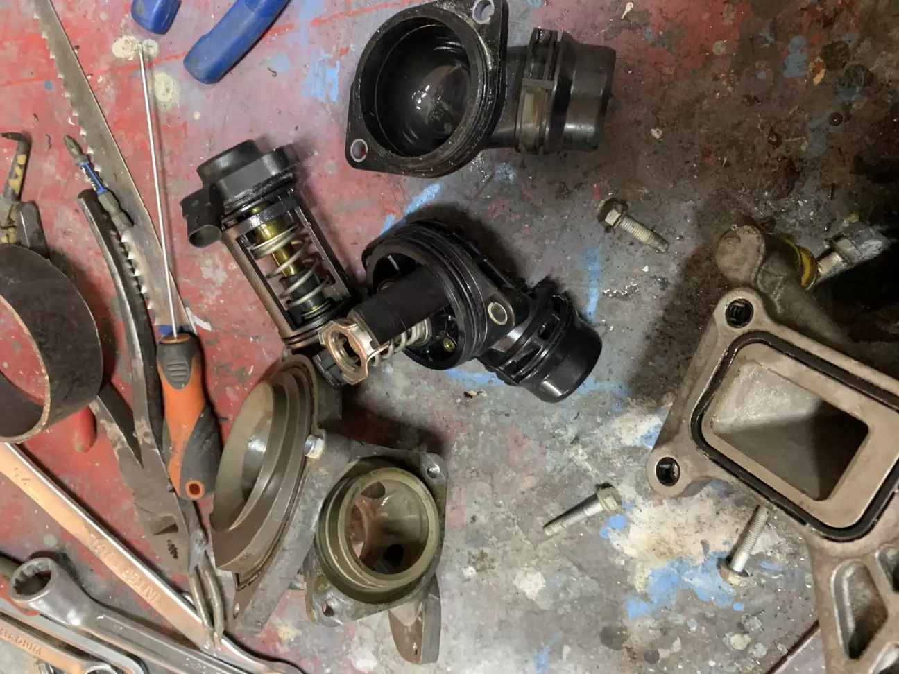 на перший погляд все здавалось елементарно злити антифриз,відкрутити два болта і все,а насправді виявилось шо відкрутивши два болти нічого не виходило,прийшлось знімати ввесь вузол помпи бо на двигуні стоїть інший термостат,який немає можливості придбати,а щоб поставити новий потрібно міняти корпус термостата.