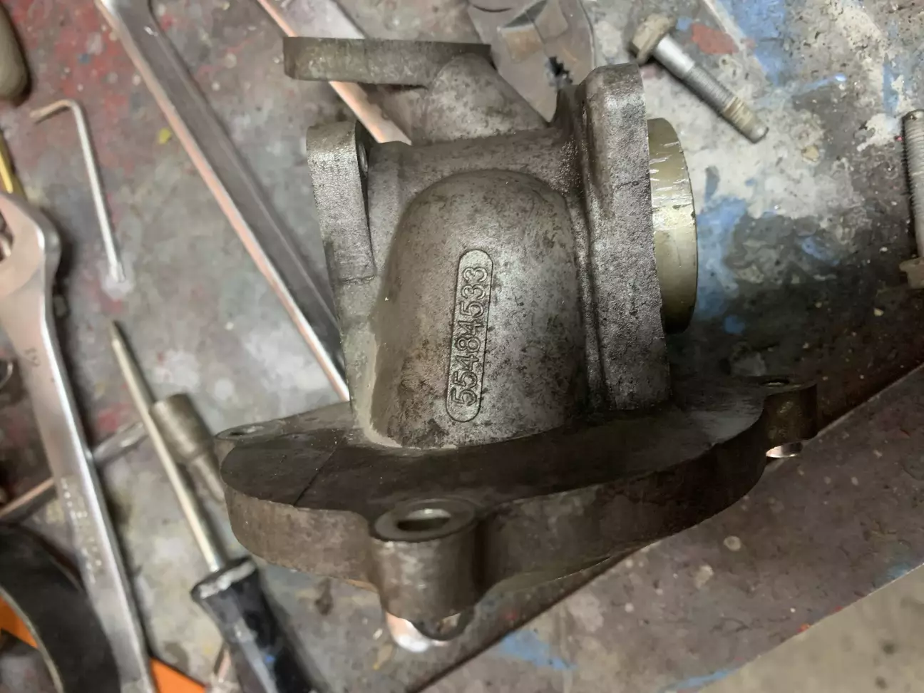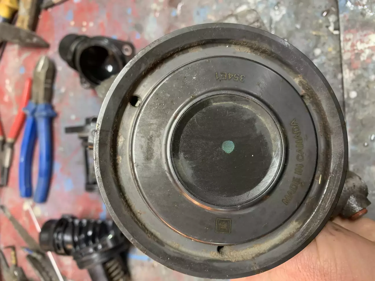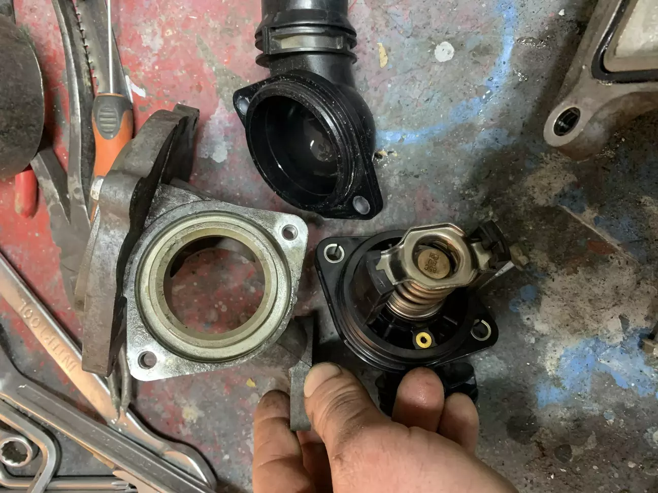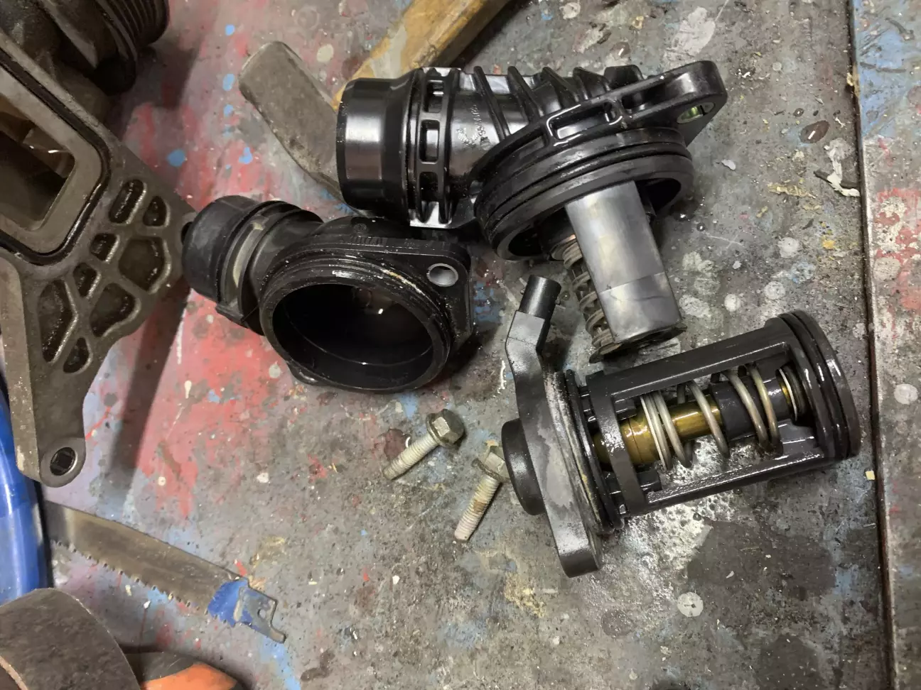 на перший погляд все здавалось елементарно злити антифриз,відкрутити два болта і все,а насправді виявилось шо відкрутивши два болти нічого не виходило,прийшлось знімати ввесь вузол помпи бо на двигуні стоїть інший термостат,який немає можливості придбати,а щоб поставити новий потрібно міняти корпус термостата.
