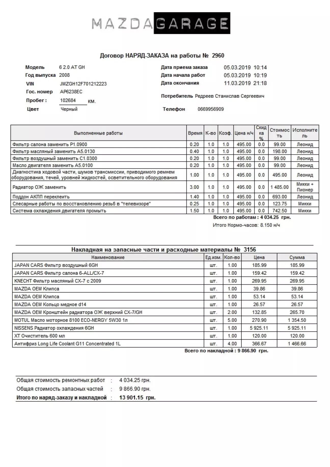 Причина візиту - помилка АКПП, технічна причина заміни радіатора - пробоїна та смішування охолоджувальної рідини з мастилом АКПП.