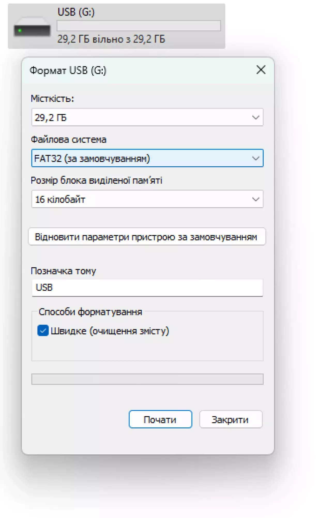 Для оновлення системи потрібна картка памʼяті SD або звичайна USB флешка, обирайте те, що є під рукою. Її потрібно відформатувати, вибравши файлову систему FAT32.