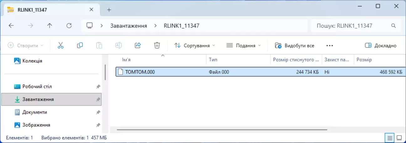 Всередині архіва (RLINK1_11347) буде знаходитись всього один файл (TOMTOM.000), його і потрібно зкопіювати на флешку чи картку памʼяті. Завершивши з цим, можна переходити до салону авто.