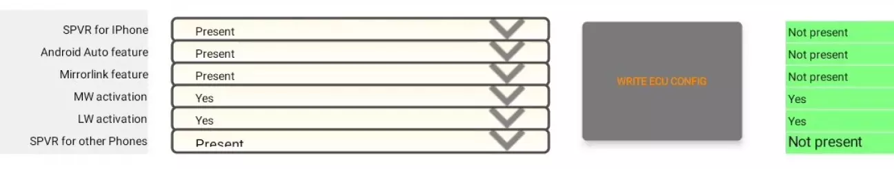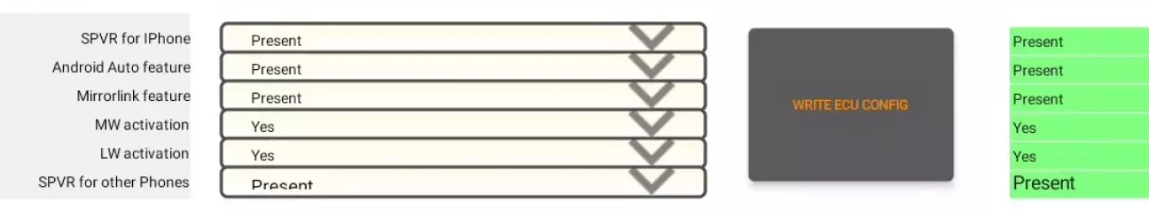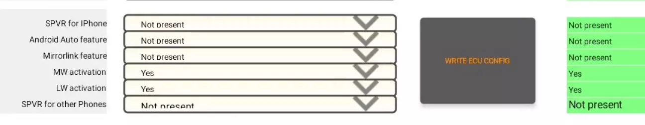 Після цього, відкриється сторінка з купою параметрів, які можна змінити. Ті що необхідні для активації AndroidAuto знаходяться з самого низу, тому сміливо можна гортати в самий низ, до групи ECU configuration, де будуть очікувати наступні параметри: