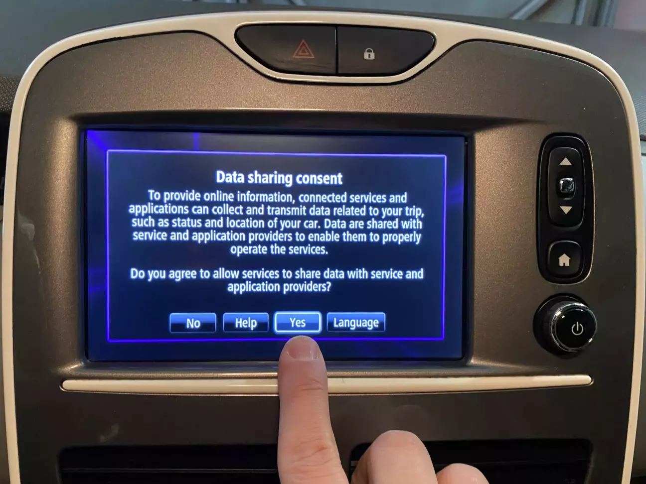 Дочекавшись увімкнення, потрібно надати доступ системі, до пристроїв, щоб вона могла запускати AndroidAuto обмінюючись з ними даними. Це робиться лише один раз, але потрібно зробити. Для цього заходимо в меню магнітоли, вибираємо Services, Settings, Data sharing settings та натискаємо Yes.