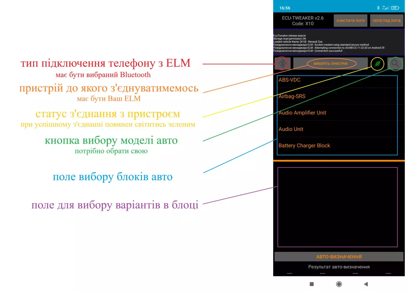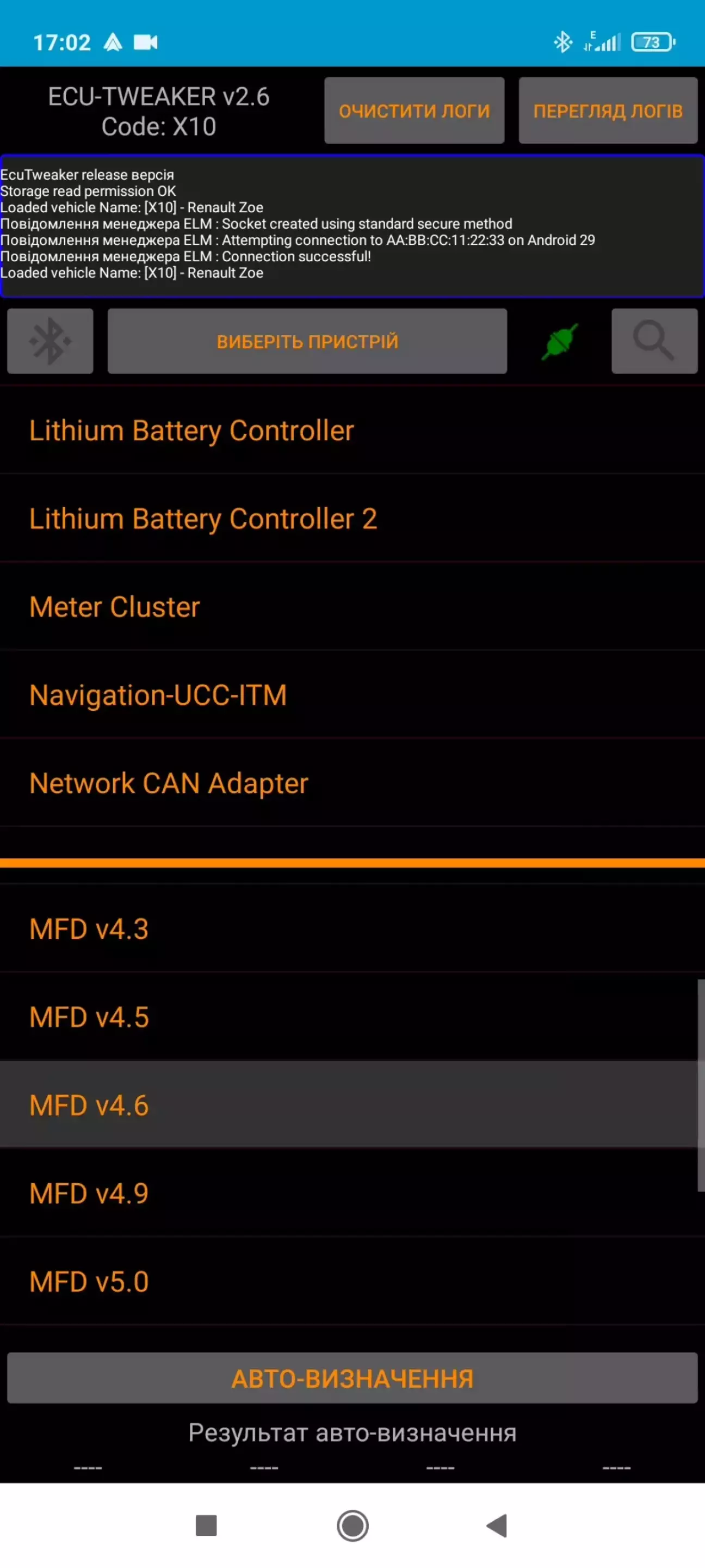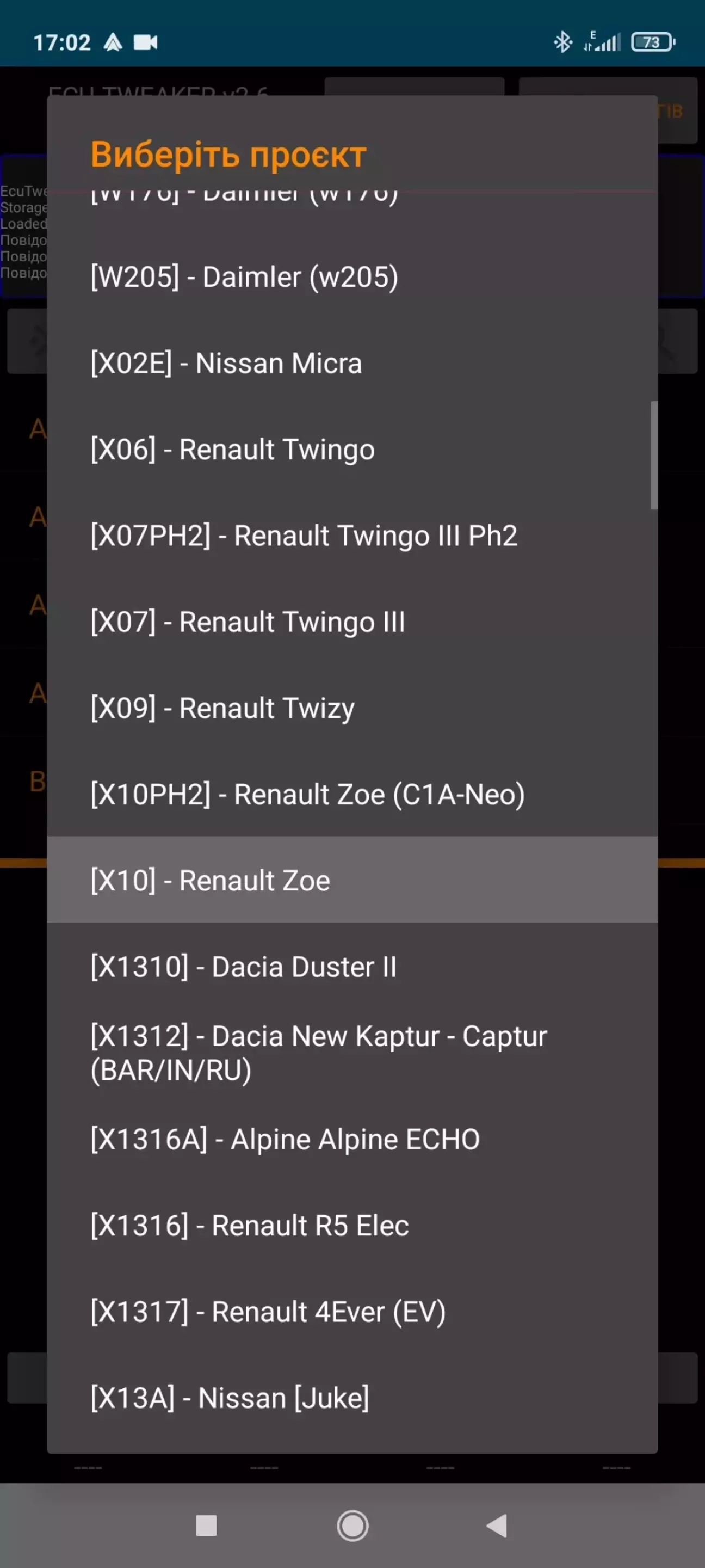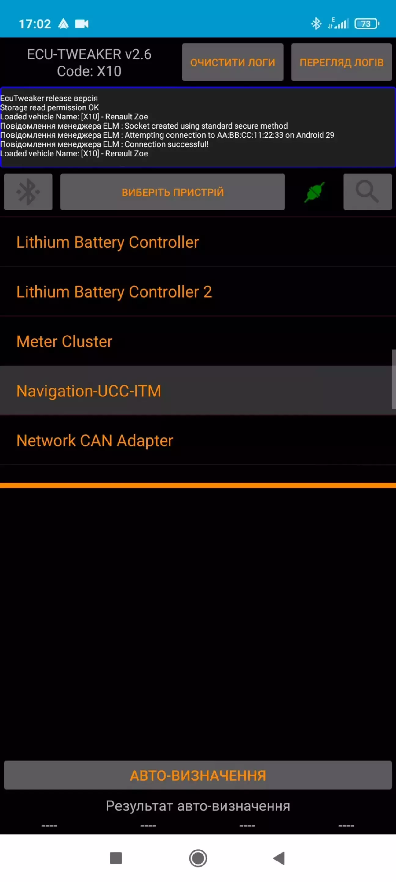 Зайшовши в ECUTweaker одразу вибираю типом підключення Bluetooth, пристрій до якого буде підключатись, свій вже з'єднаний з телефоном ELM, після чого статус з'єднання змінив колір на зелений. В пункті вибору моделі, серед всіх шукаю та обираю Renault ZOE.