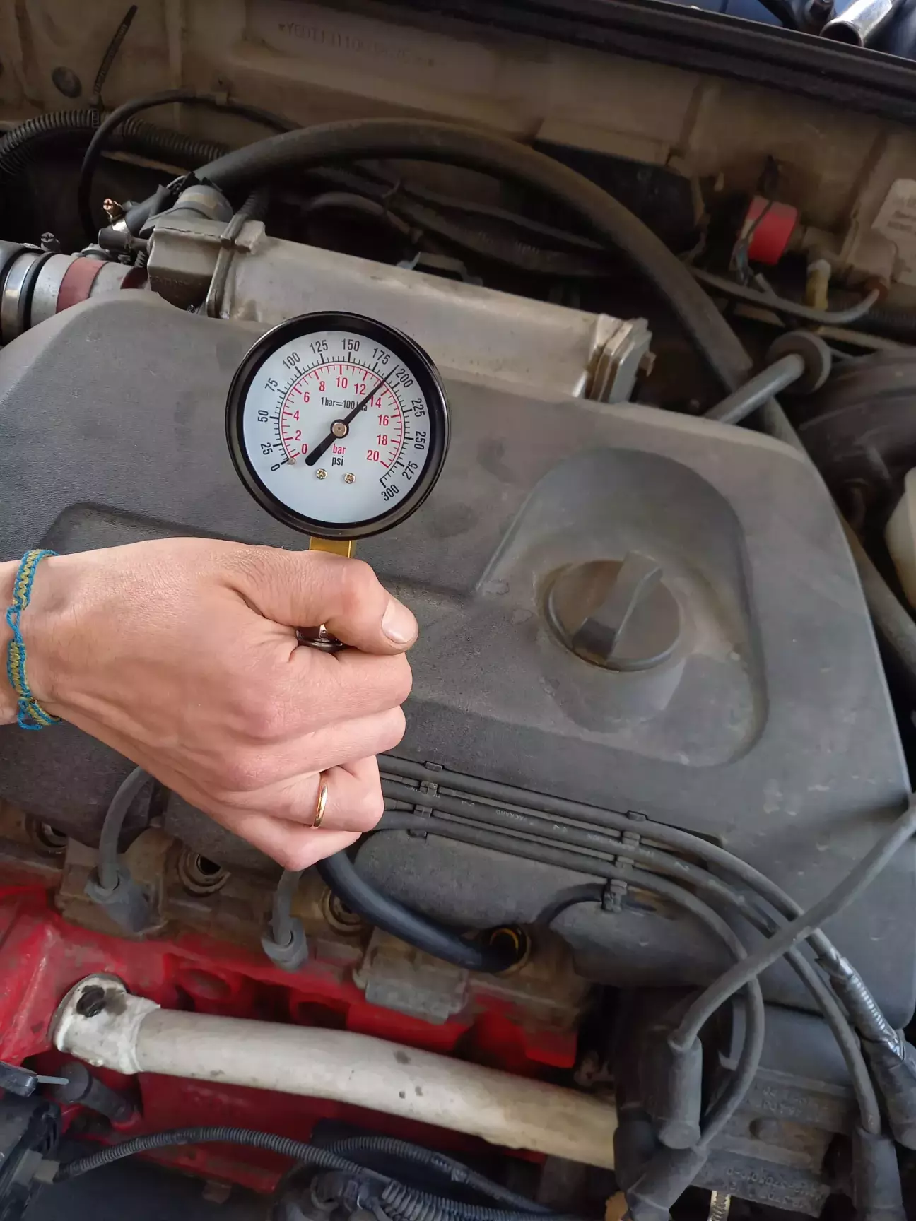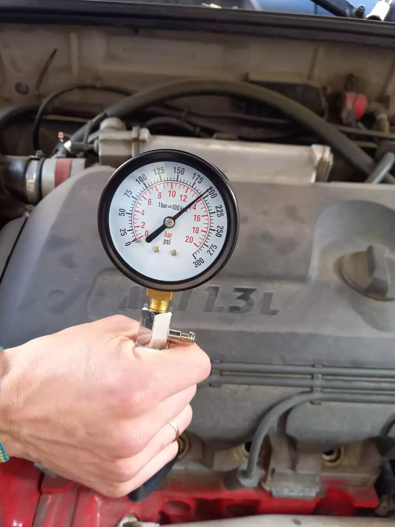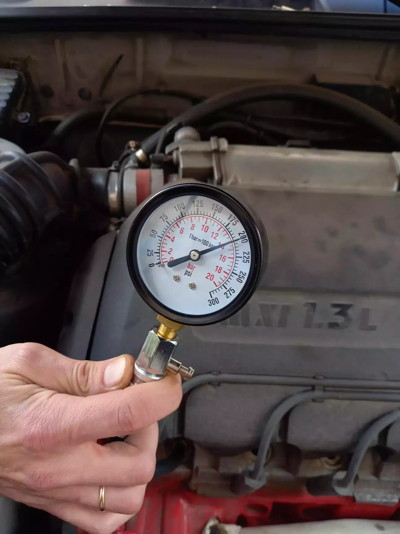 Заміри проводив на гарячу після прогрівання двигуна. Не забуваємо: зняти фішку модуля запалювання, вийняти реле бензонасоса й викрутити всі свічки.