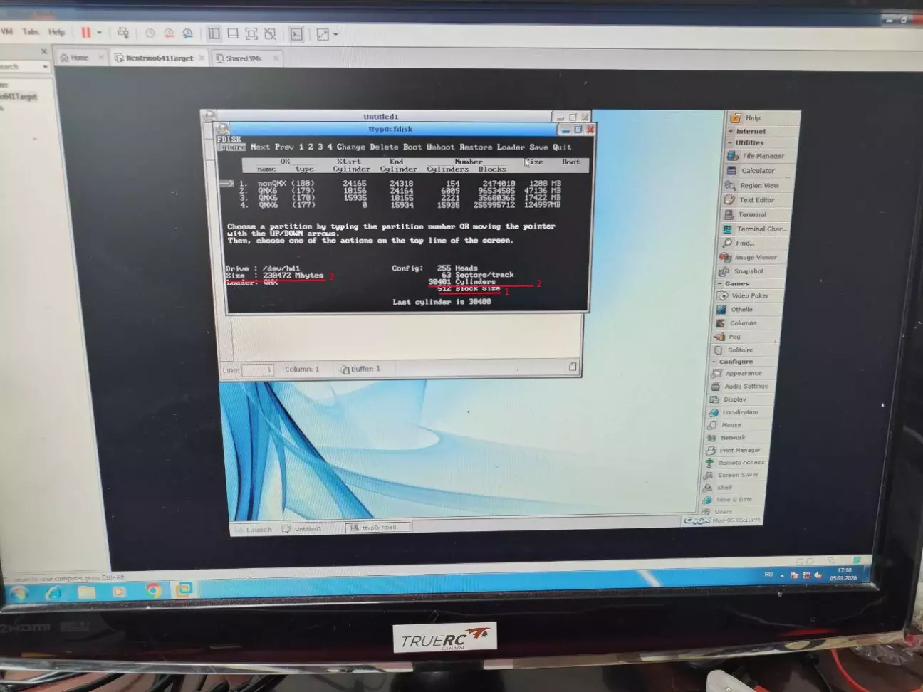 Що потрібно для розрахунків. Диск розбивається на дорожки(циліндри) в кожному циліндрі є певна кількість секторів з мбайтами інформації. Задача розбити диск так, як було розбито на заводі( ну або схоже до того, або як радять в інтернеті). Але проблема в тому, що qnx потрібно вказати перший циліндр(початок) і останній(кінець) а він вже сам розрахує кількість секторів, і скільки ГБ вийде розділ. Давайте порахуємо на прикладі 177 розділу. І так справа внизу (2) маємо кількість циліндрів, зліва внизу маємо об'єм місця в Мб - це весь наш диск. В моєму випадку 238472/30401= 7.84 Мб на 1 циліндр. 177 розділ займає 122гб, а це значить 122*1024/ 7.84= 15934 циліндри. Заносимо показника в таблицю. 178 розділ починається з 15934 і... Ну ви зрозуміли. Розміри оригінальних розділів приводжу нижче.