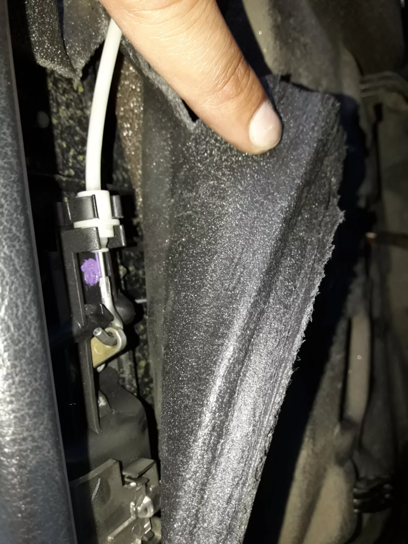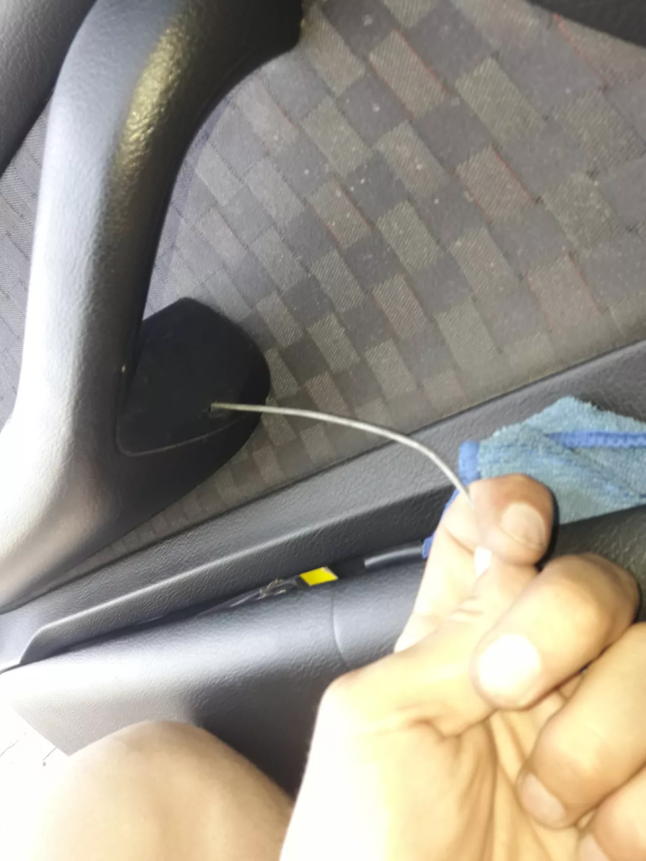И теперь самое интересное — залезаем внутрь двери рукой правее левой(задней) салазки стеклоподьемника в сторону дверной ручки, при чем тыльной стороной ладони к себе, находите этот рычаг, и указательным пальцем поддеваете запорную часть штифта, которая лежит сверху на рычажке, немного выдвиньте штифт. В это же время, для более удобного расположения рычага открывания левой рукой "открываем" дверную ручку(таким образом рычажок открывания станет намного доступнее для пальцев правой руки и обзор к кардебалету улучшится.