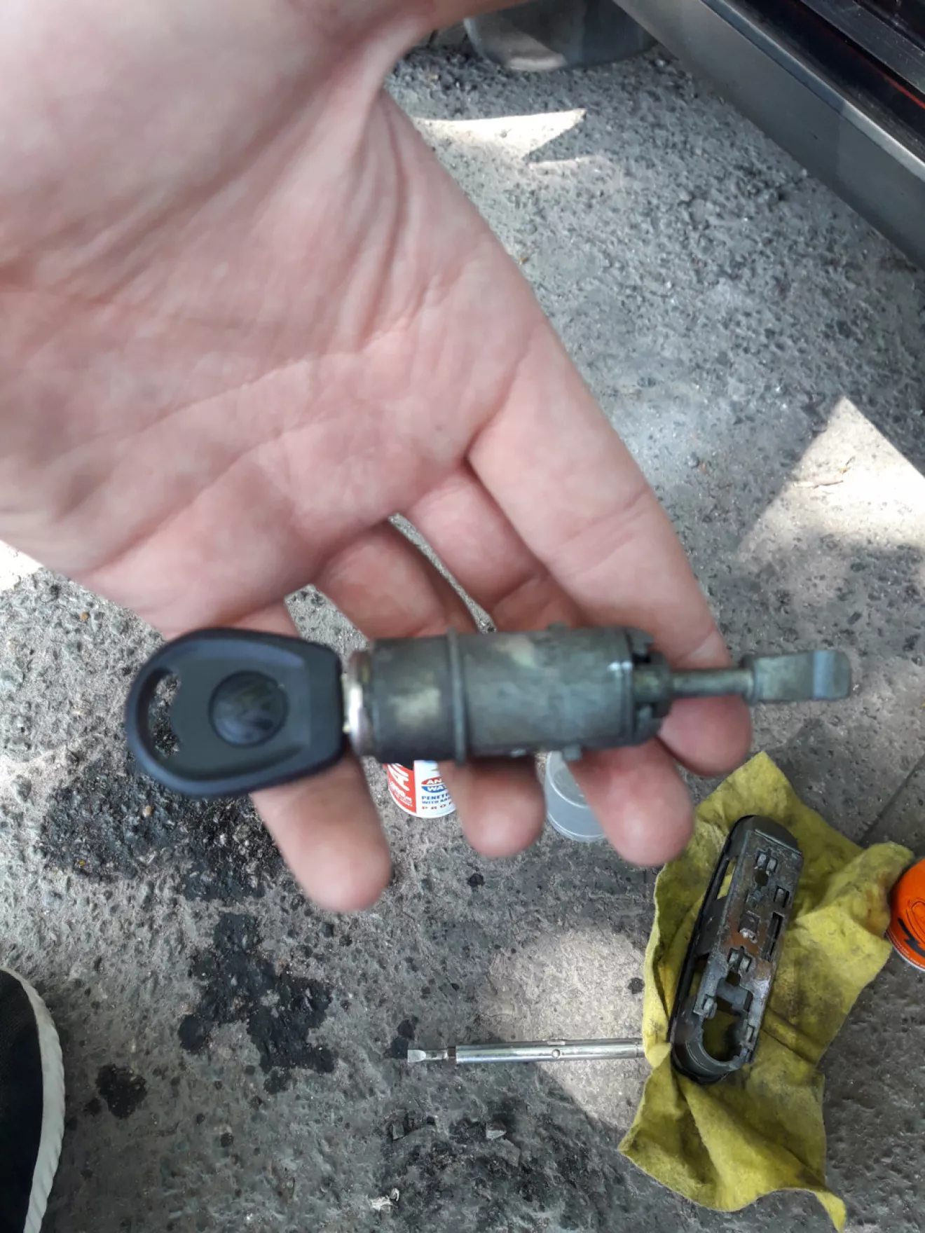 Всем привет! Наступило настоящее лето, даже чересчур настоящее, а значит можно свободно ломать машину прямо возле дома=) с момента вьезда в Украину на машинке был только один ключ и ни одна личинка, кроме замка зажигания не работала. Об этом я узнал вовремя, собственно уже после покупки при общении с бывшим (до перекупщика) владельцем. Я начал искать варианты решения проблемы, первым вариантом я нашел комплект личинок с ключом под заказ за всего лишь 170 Евро, что как бы пипец как дорого, дальше думал за разборы, а потом вспомнил, что пару лет назад потерял ключи от мерина и познакомился с приятнейшим мастером по изготовлению ключей. Вот и в этот раз решил к нему обратиться за помощью и советом. приехал к нему, рассказал свою "беду", он посмотрел машину и подтвердил мои самые желанные опасения — личинка подходит под ключ, просто сломана! А это значит что я делаю дублирующий ключ (пока что всего лишь жало без чипа и радиобрелка, так как зарплата не позволяет) и снимаю ему личинку "в поликлинику на опыты". Итог — сутки работы мастера, сутки паранойи про то, что кто-то вскроет машину отверткой, 200 грн ключ, 200 грн личинка и можно приступать к возврату потрохов на место. момент снятия личинки не описал, решил показать как снять ручку без демонтажа стеклоподьемника с помощью женской невидимки и самого стандартного инструмента — тонки плоскогубцы, отвертки толстая жесткая проволока, силиконовая смазка и жидкий ключ. Начну с самого начала: