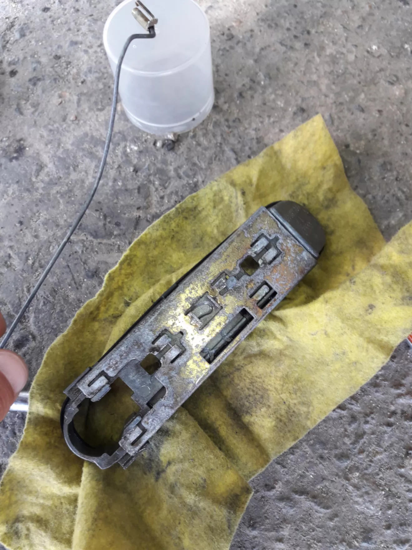 Далее на ручке изнутри видим что она состоит из бутерброда, и чтоб ее снять, нужно этот бутерброд "раздвинуть". пластина из "желтого металла должна сдвинуться вправо