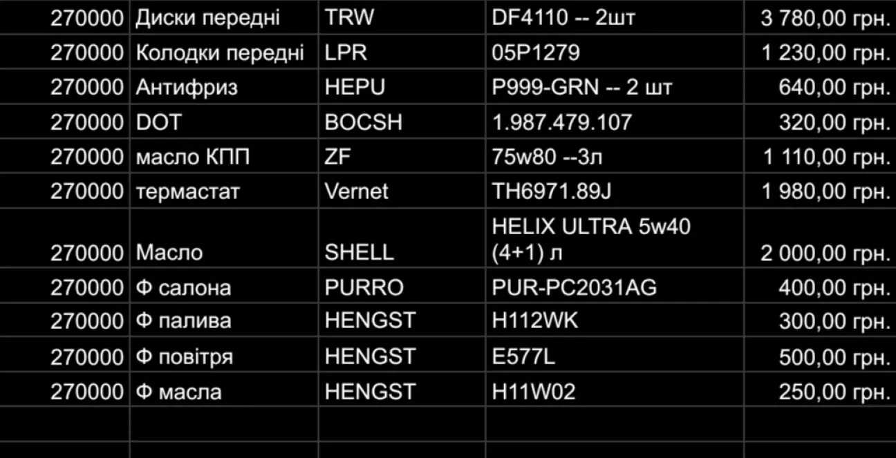 Перше ТО після покупки, трохи затянув але то що було розписано попереднім власником сходилися. Заміна стояла на 272000 але сильно не хотів перекативати.