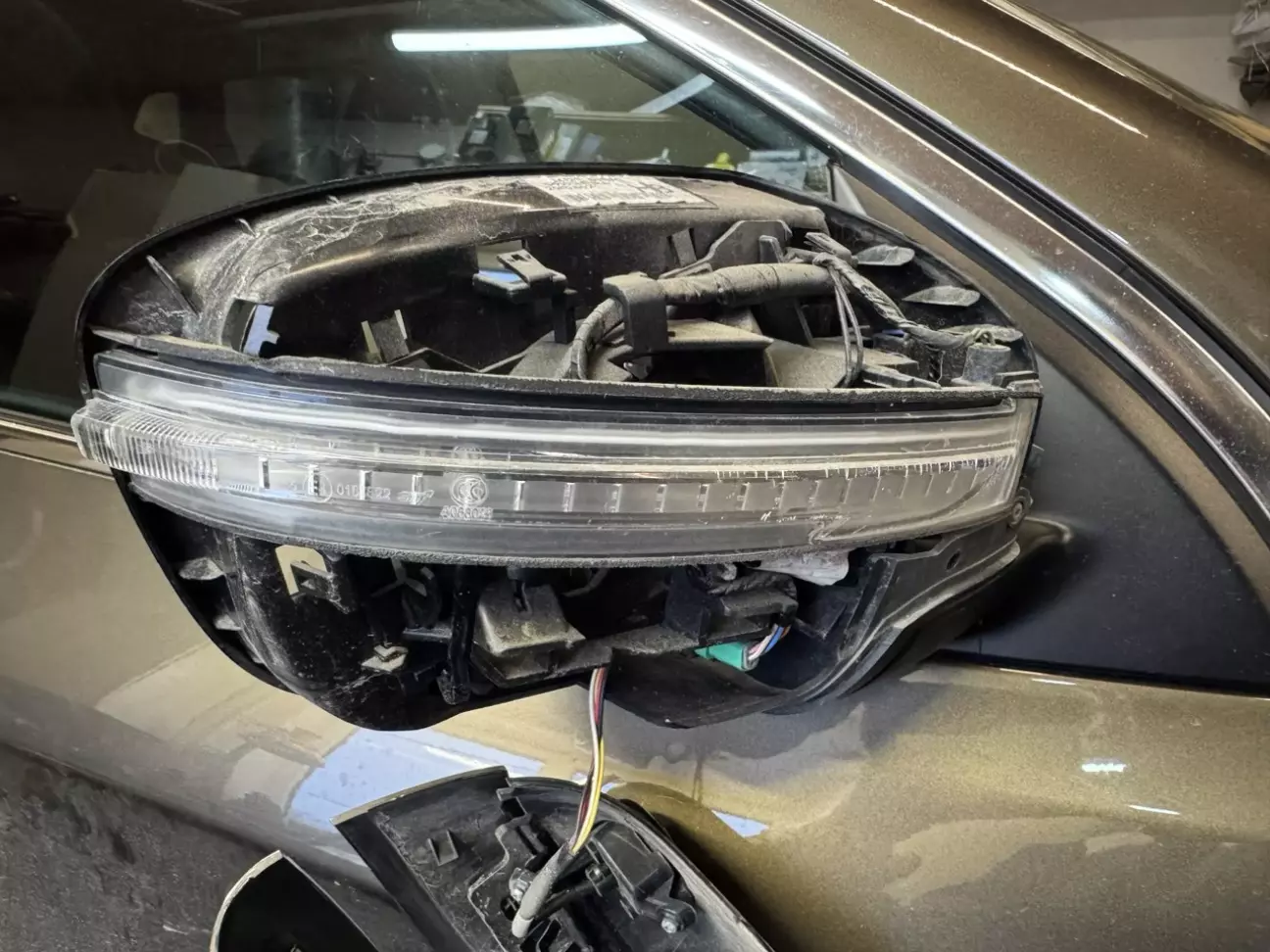 Як проводити заміну також почерпнув з відео вище. Все доволі зрозуміло і нескладно, головне - бути обережним. В першу чергу зняв дзеркальний елемент, далі по інструкції викрутив необхідні гвинти( для заміни повторювача можна викручувати не всі що маються), від'єднав накладку, вона знімається разом з нижньою частиною пластику, в якій кріпиться камера 360. Так як роботи проводив при мінусових температурах - попередньо обережно прогрів все дзеркало промисловим феном, щоб пластик був більш еластичний і максимально вберегти всі застібки. Роз'єми не чіпав - деталі важать небагато, тому обережно залишив їх триматись на дротах.