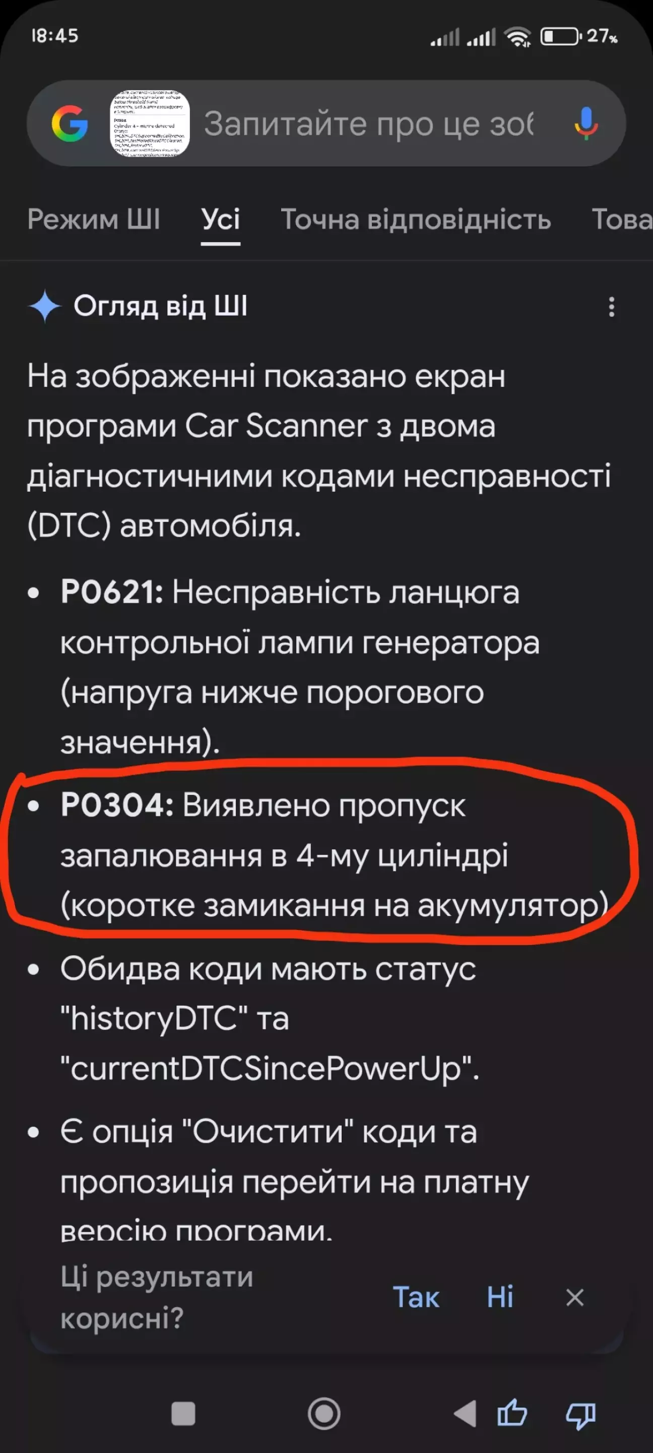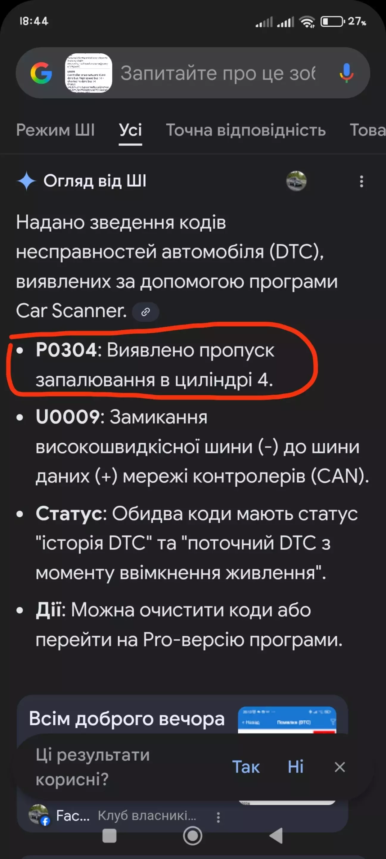 Нагадаю, 2 місяці тому замінені свічки (на сьогодні пройшов близько 2000 км) - авто працювало чудово, за 2 дні до нового року засвітився CHECK та затроїло авто, 2 січня зроблена діагностика - пропуски запалювання 4го циліндра, того ж дня замінив котушку запалювання. Помилка зникла на 2 дні, авто працювало чудово, на 3й день знову CHECK та почало підтроювати, під час розгону інколи провали, затупи.