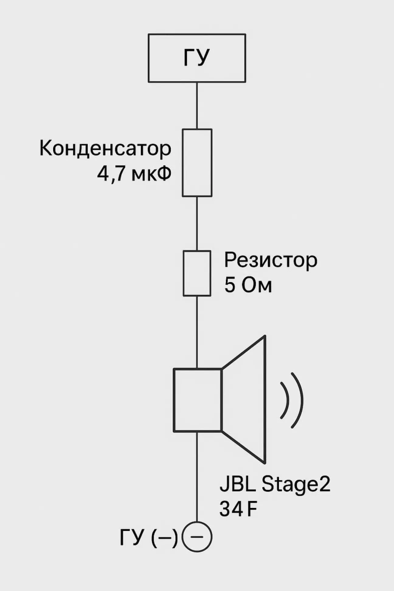 Оскільки торпедні динаміки живляться від тих самих каналів, що й дверні, з метою збереження стокових значень навантаження на головний пристрій та підсилювач підключення виконано через послідовний резистор 5 Ом (щоб повернутись до стокових 8) і конденсатор 4,7 мкФ. Таке рішення обмежує роботу торпедо верхнім діапазоном частот (приблизно від 4 кГц), захищає динаміки від перевантаження та вирівнює їх рівень гучності відносно дверей. У результаті сцена піднімається вгору, звук стає більш читабельним, а система зберігає стабільну та передбачувану роботу без ускладнення схемотехніки. Не забуваємо, що на всіх динаміках в авто треба змінювати полярність при підключенні Jbl.