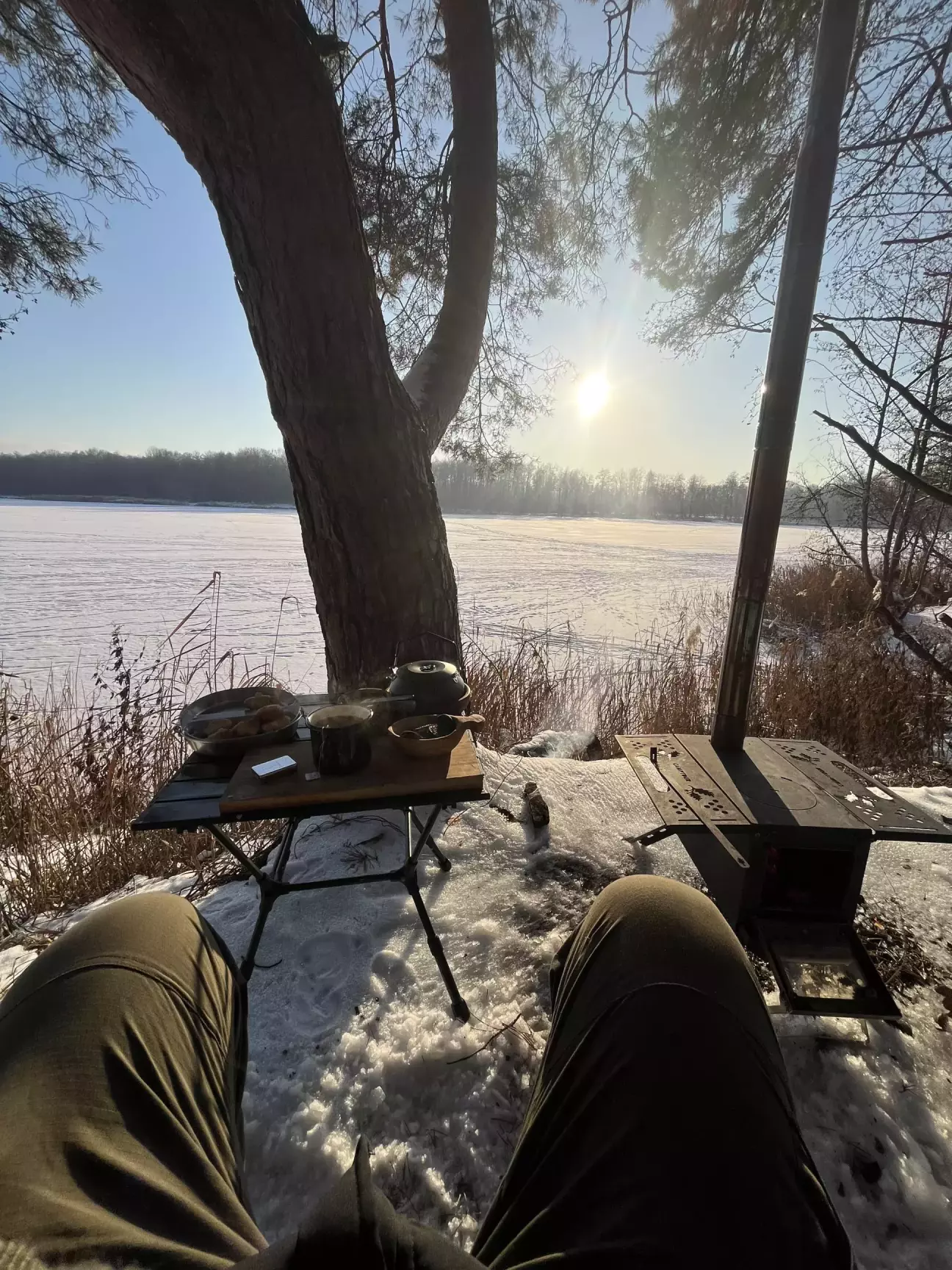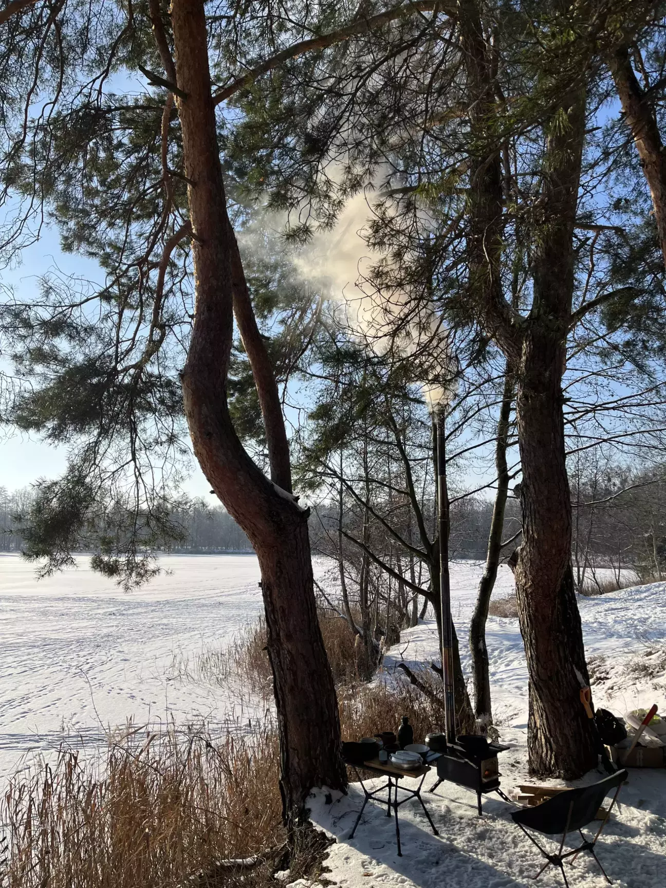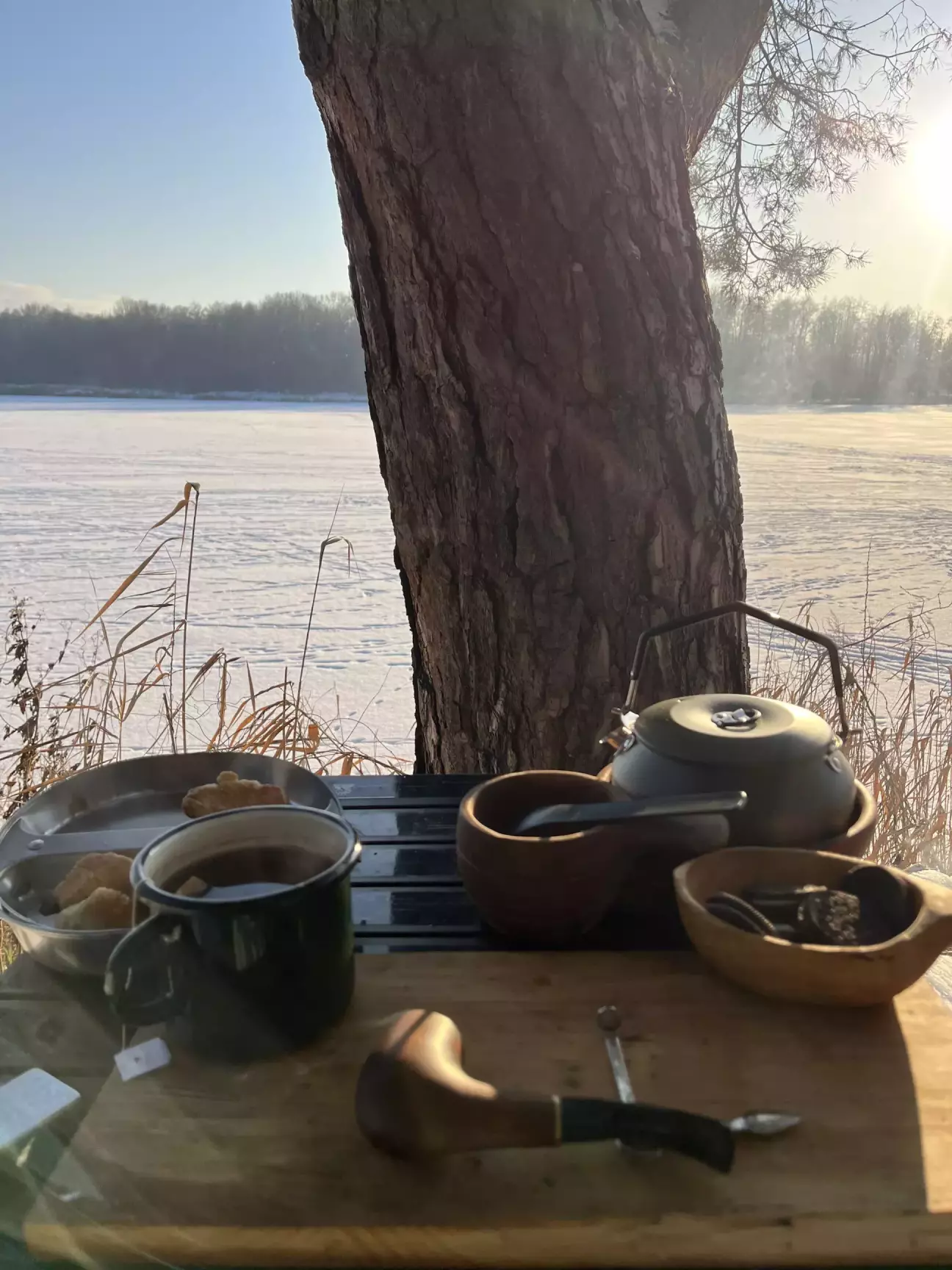 А коли в неділю зранку, я зрозумів, що круто було б попити чаю на озері, то стикнувся з шматком льоду, який роздовбував.