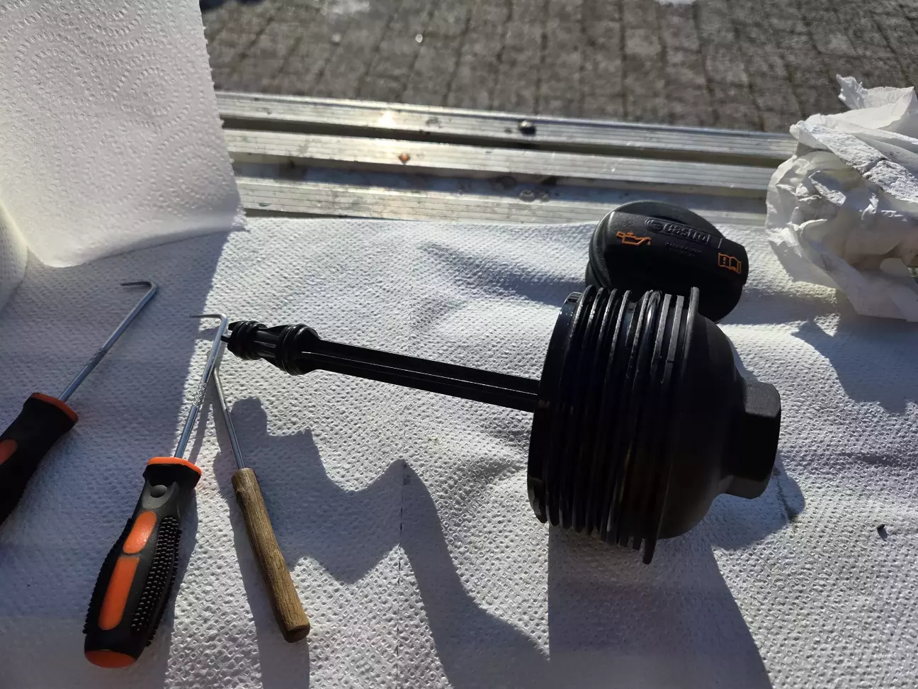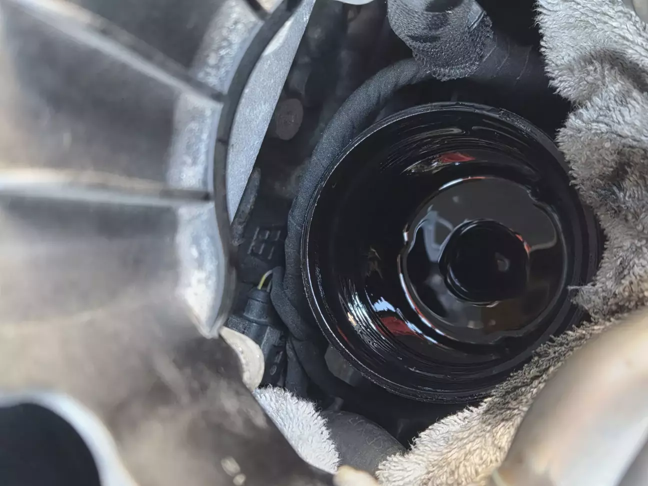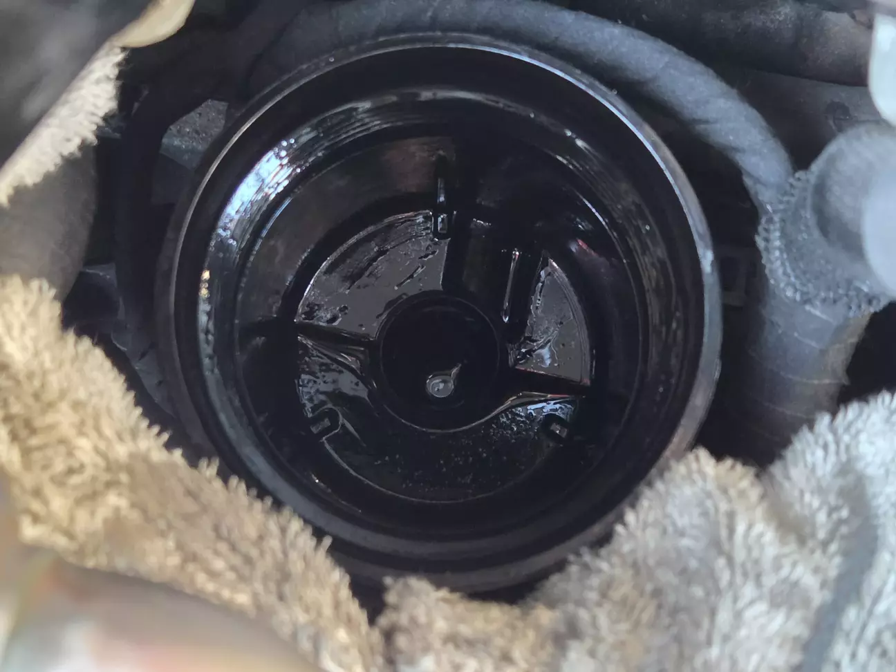 І доки масло там внизу цюнькає, головкою "на 32" відкручуємо кришку масляного фільтра. Попередньо відкрутивши якийсь датчик, чи то клапан.