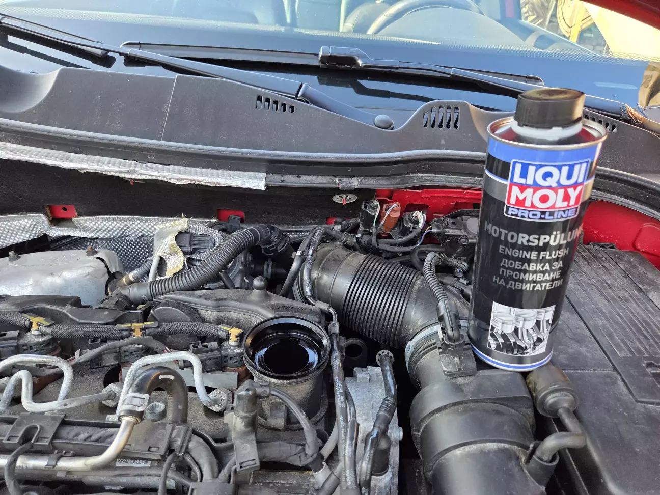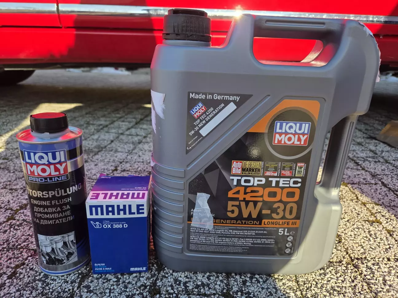 А зараз я заміню тільки фільтр масла і відповідно, саме масло. Також додам промивку двигуна, і присадку у свіже мастило. То ж погнали! Заводим машину і поки вона трохи прогрівається, я знімаю нижній пильник двигуна, знявши його, їду трохи катнути, щоб масло вийшло на робочу температуру (90 град). Завдяки Вебасто це відбувається швидко. Далі, повернувшись на подвір'я, глушу мотор, щоб не розкидало масло по мотору і вливаю промивку двигуна. Liqui Moly Pro-Line Motorspülung (артикул 2427) — це професійний засіб, який значно відрізняється від «м'яких» споживчих промивок. Вона розроблена для глибокого очищення масляної системи перед заміною оливи.