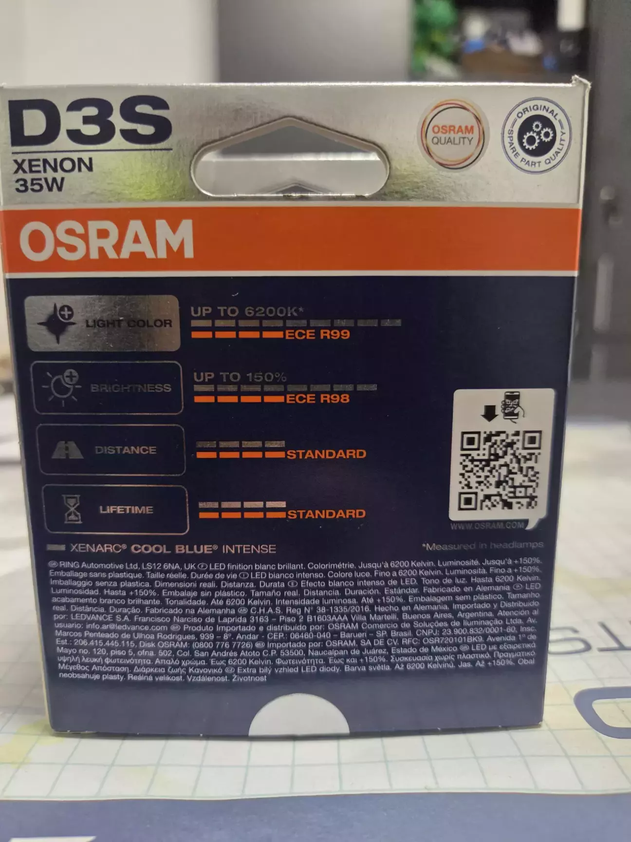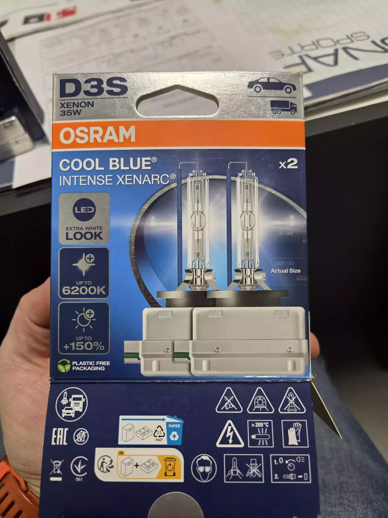 По дорозі назад, їдучи вже у сутінках помітив зліва яскравий спалах і раптово стало гірше видно дорогу. Через кілька секунд з'явився запис, що не працює ліва лампа... от трясця! Знову шось відригнуло. Дійсно, приїхавши додому бачу, ліва фара не світить. Ясно. Ця поломка веде до тюнінгу. Це пакращення по-нашому. Лізу в інтернет, лампа ксенон D3S, звісно ж міняти тільки парою. Курва, ціни такі, ніби вони із золота. Ок, штатні лампи OSRAM XENARC серії Clasic чи то original. Я хотів поставити OSRAM Night Braker Laser, але ціна там космос. Треба бути скромнішим, подумав я собі і взяв лампи на сходинку нище, але не початкової серії. Вибрав OSRAM COOL BLUE INTENSE NEXTGEN.