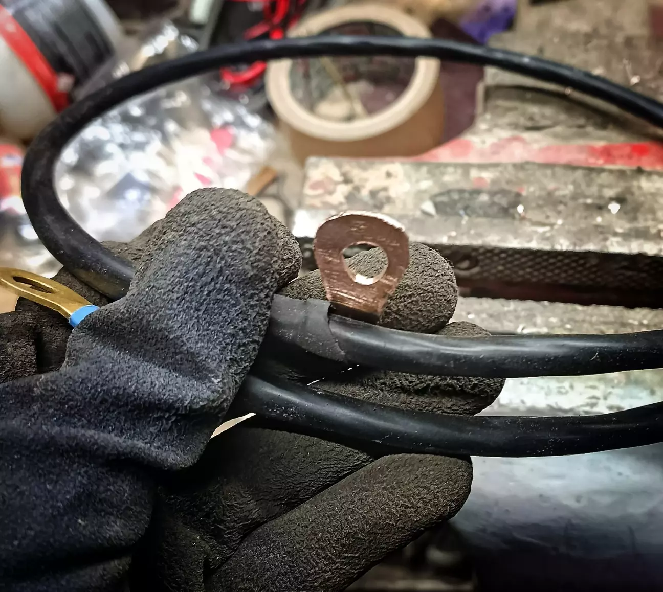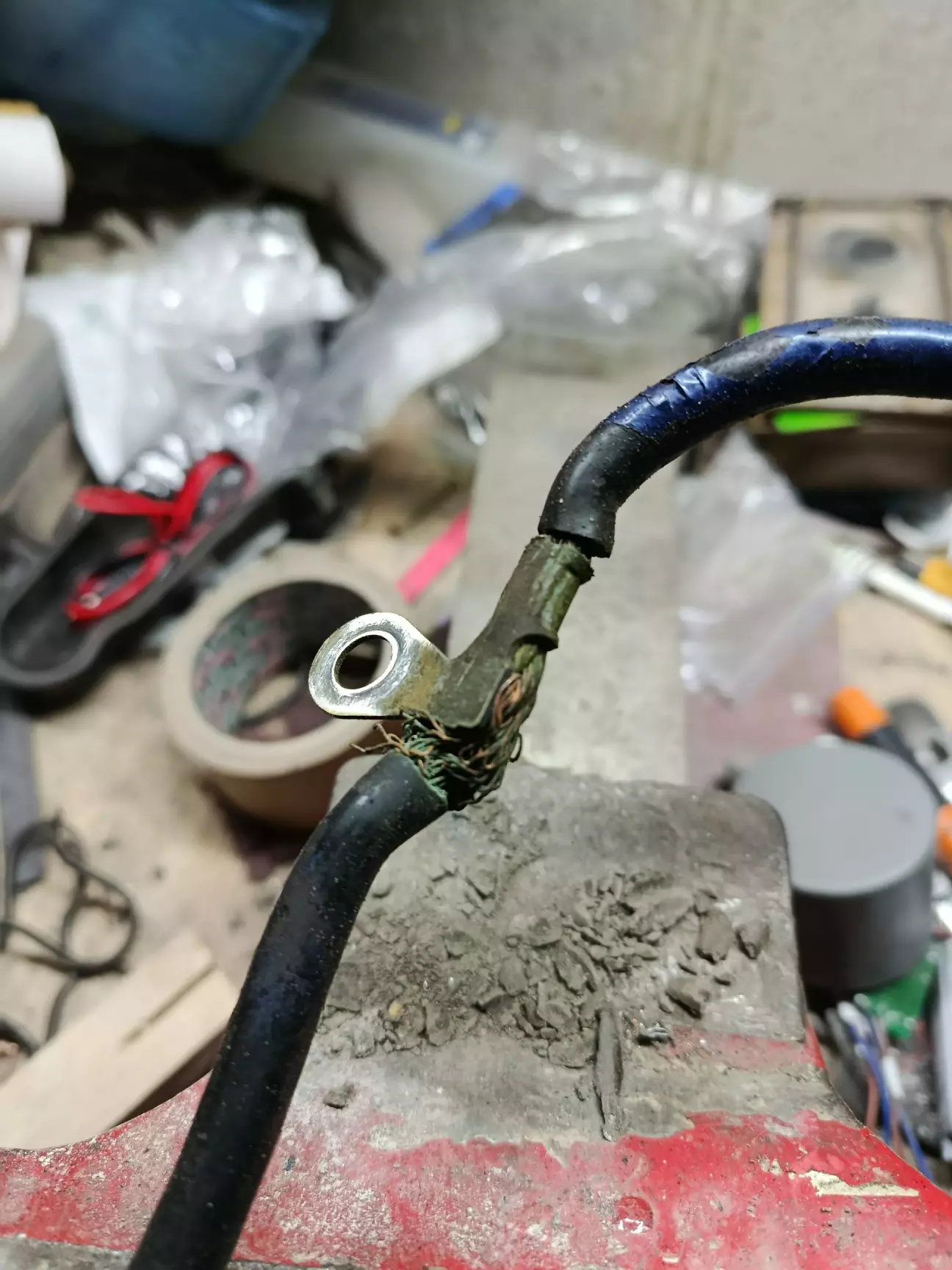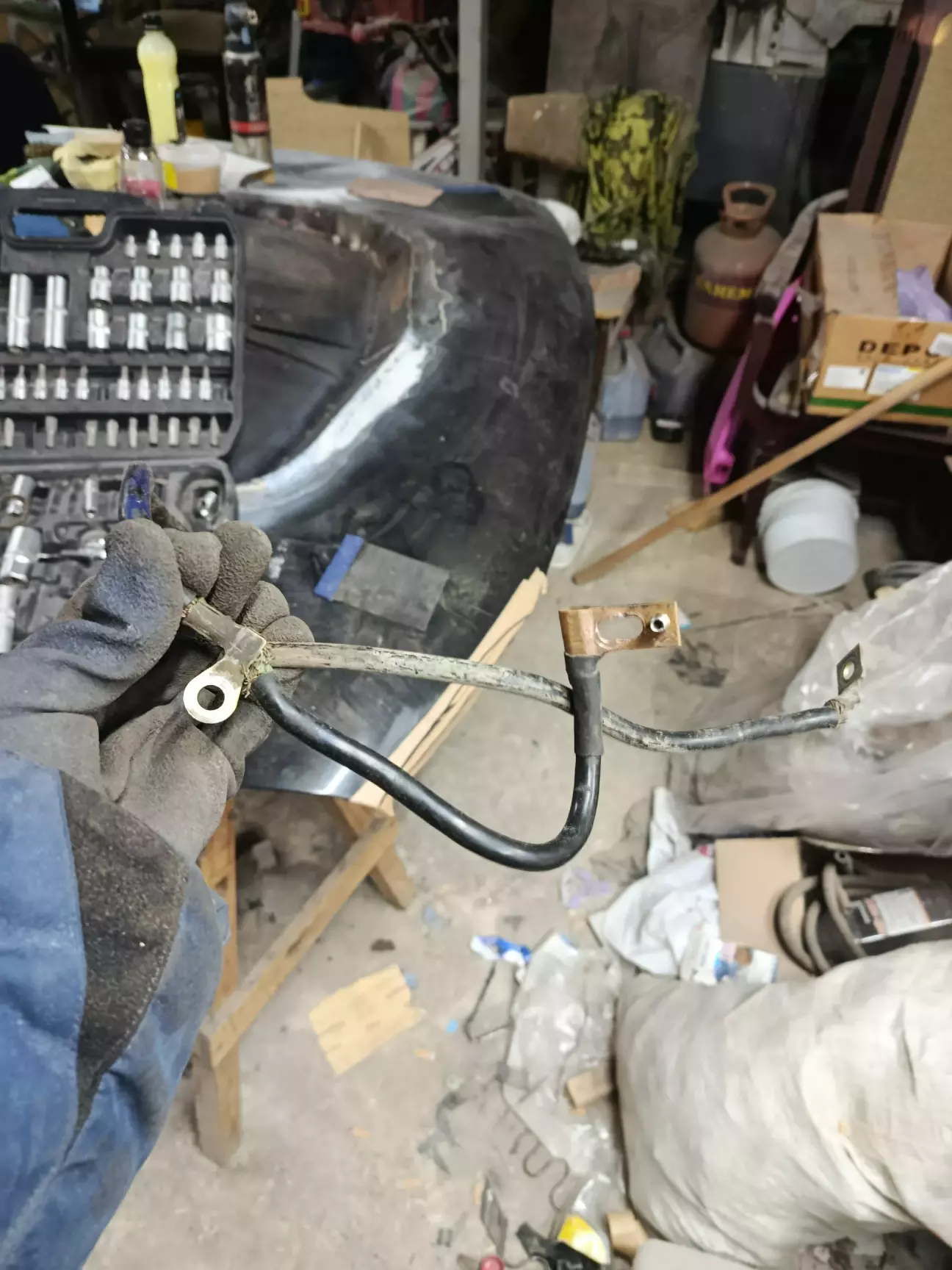 На месте крепления к кузову, она окислилась и некоторые жилки порвались. Заранее купив провод массы 80см пришлось мастерить клему так как оригинальный провод стоит как крыло от Боинга