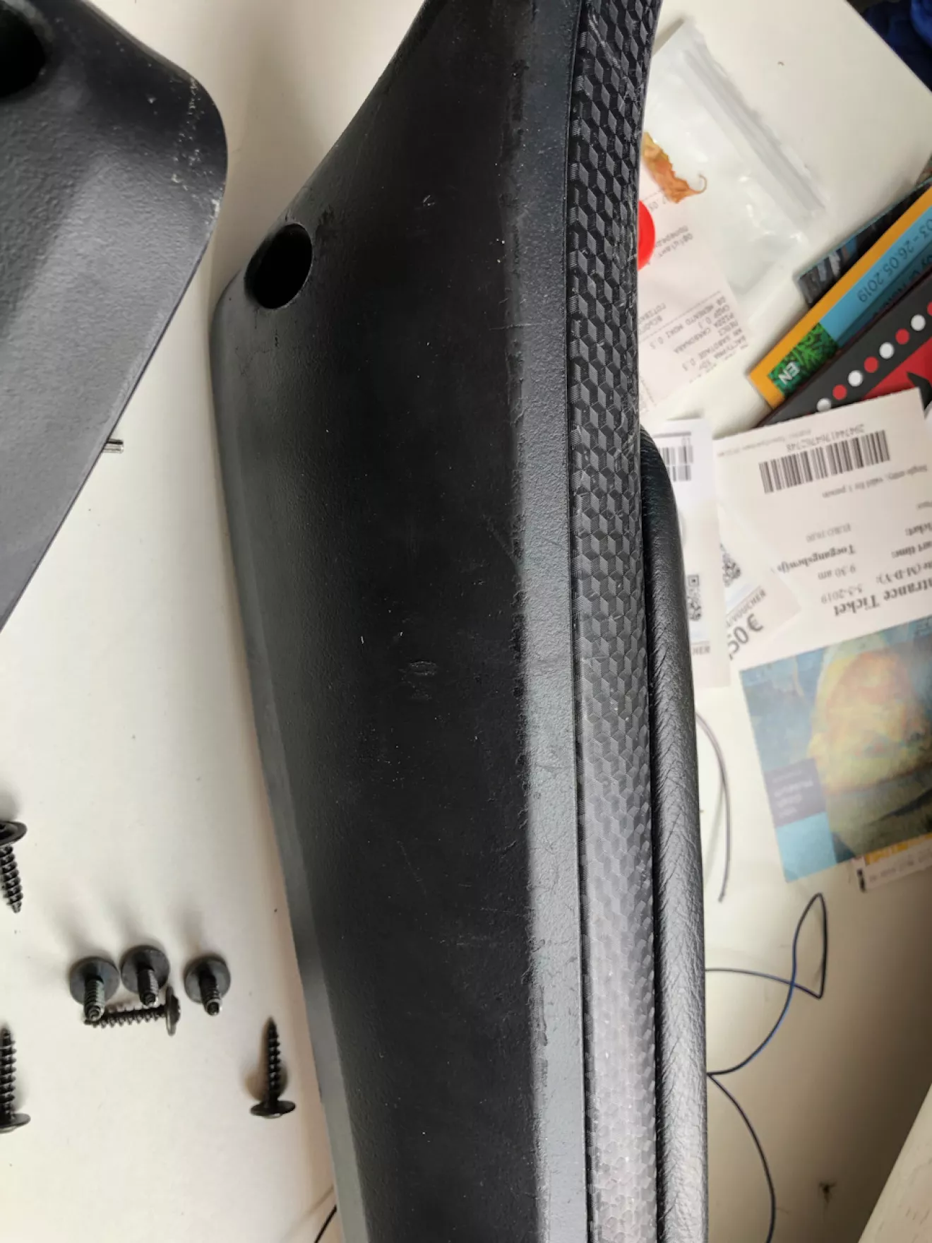 Перше що зробив — підклеїв обшивку стійки. Я вже якось її клеїв — так от, моя порада, відклеюйте її по максимуму. Я минулого разу підклеяв лише відірвані краї — вистачило на рік. За одно замінив і болти — бо злизані грані були. Ледве відкрутив.