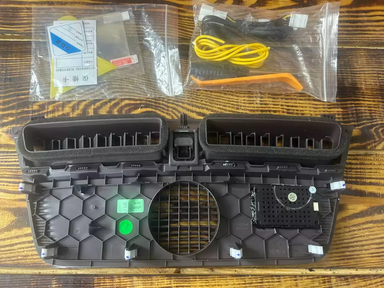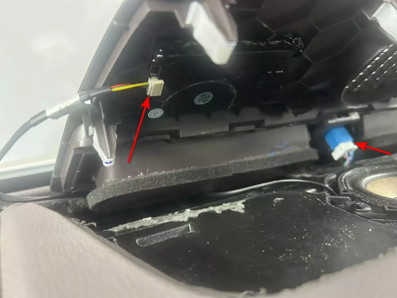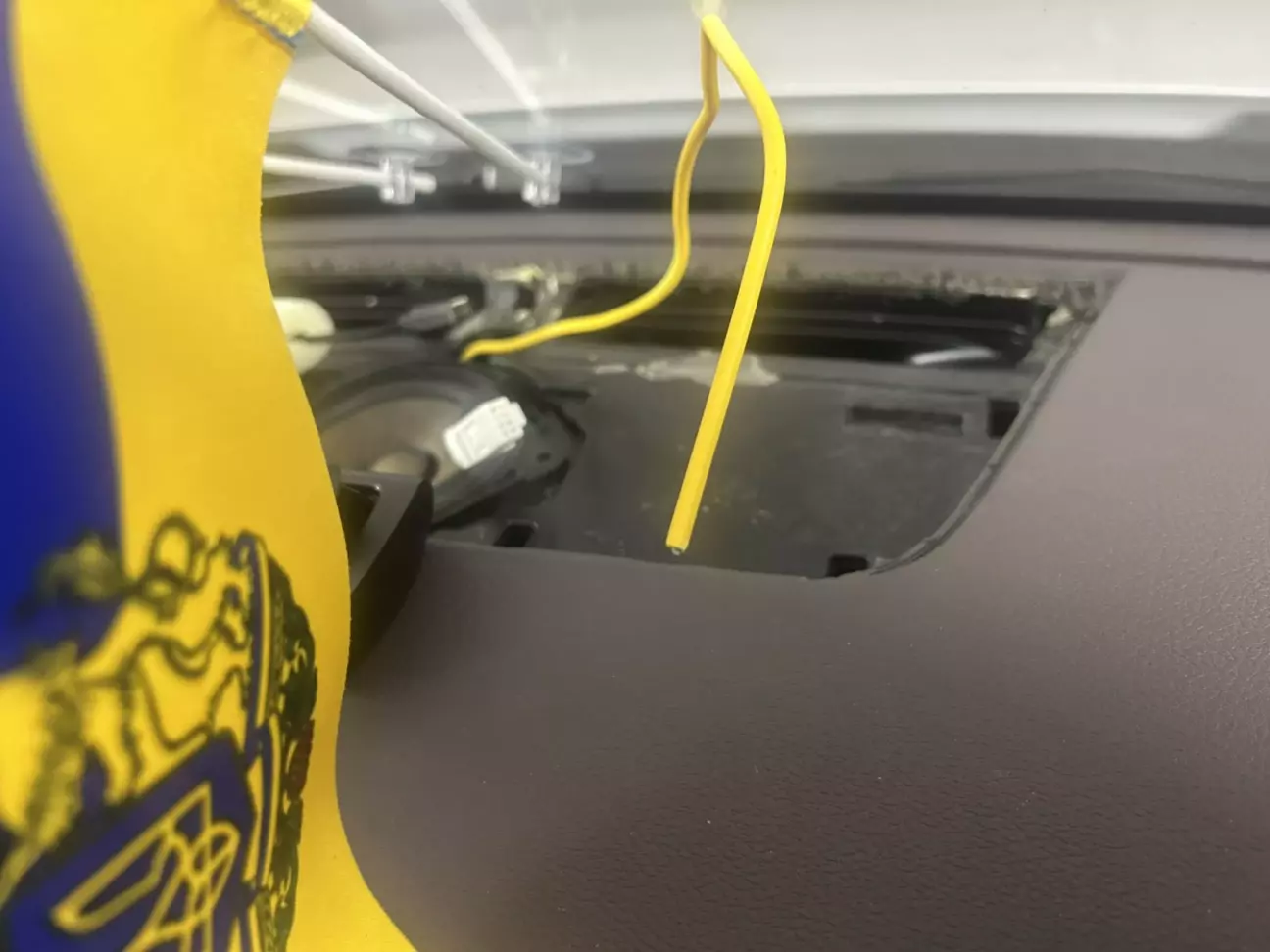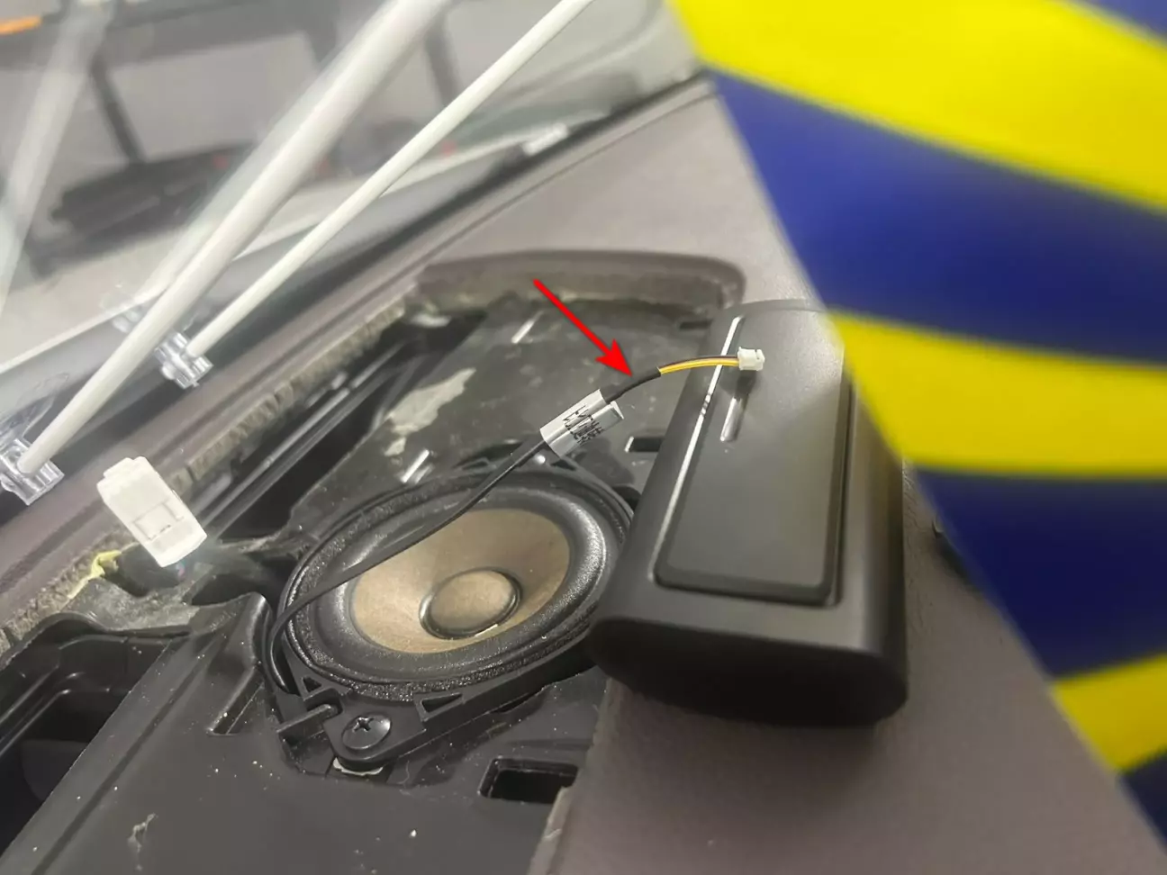 Для зручності можна зняти центральний динамік (тримається на 2-х саморізах). Примотати ізоляційною стрічкою до цього жовтого товстого проводу роз’єм з кабелем що підключатиметься до проекційного дисплею