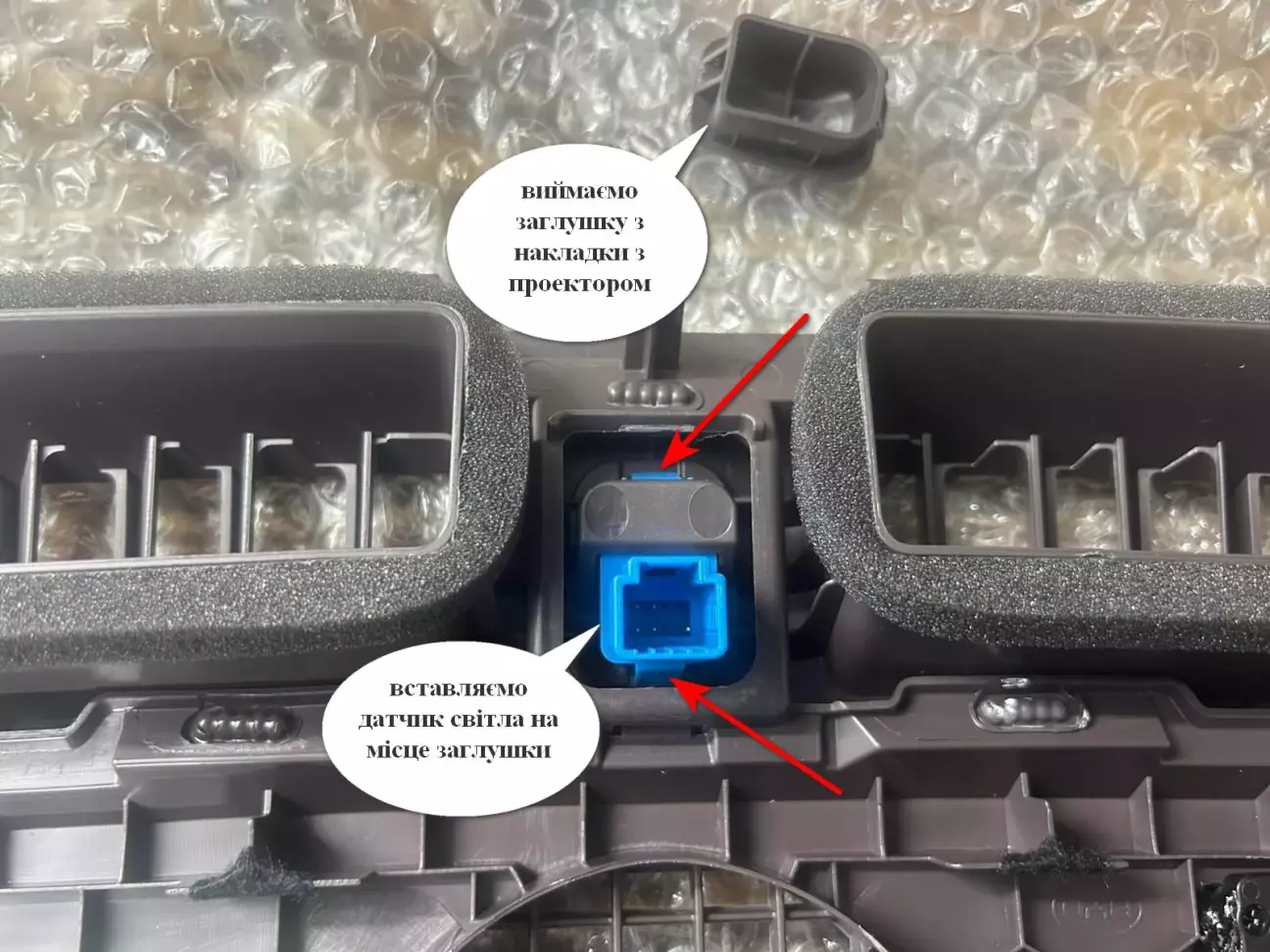 Переставити датчик світла зі штатної пластикової накладки торпеди до нової з проекційним дисплеєм – для цього притиснути викруткою пластикові тримачі датчика до середини і видавити його з накладки. З нової пластикової накладки торпеди з проекційним дисплеєм таким же чином зняти пластикову заглушку і на її місце встановити датчик світла.