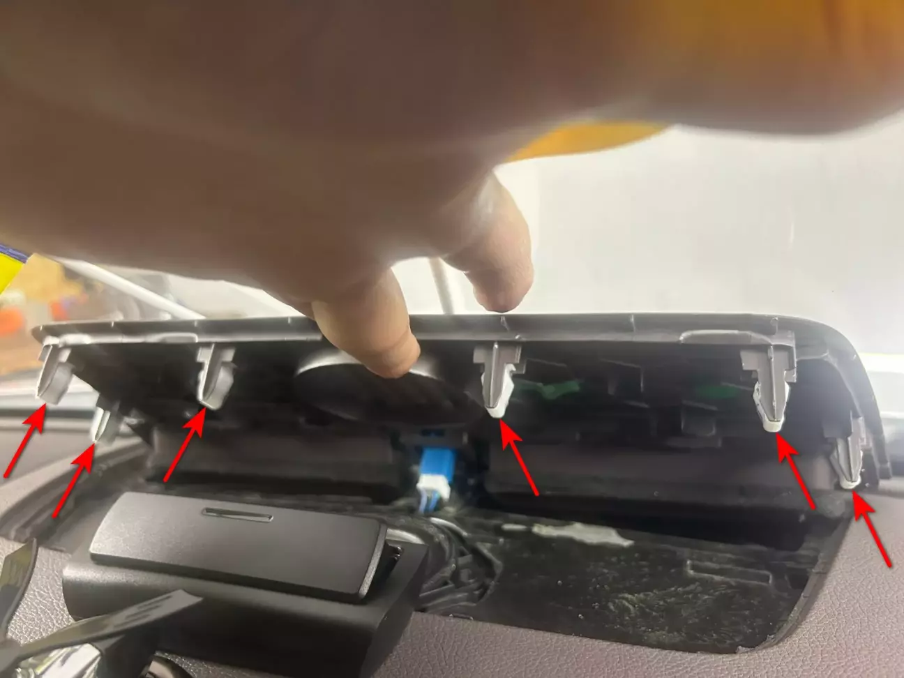 1. Зняти пластикову накладку торпеди, піддівши її пластиковою лопаткою і потягнувши вверх (тримається на 6 пластикових фіксаторах).