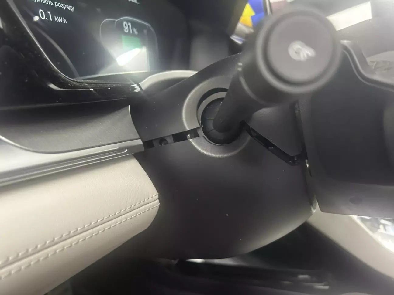 3. Протягти кабель живлення від проекційного дисплею до підкермового роз’єму білого кольору. Для цього беремо жовтий товстий провід із комплекту проекційного дисплею і просовуємо його у отвір рядом з проводом що йде на датчик світла.