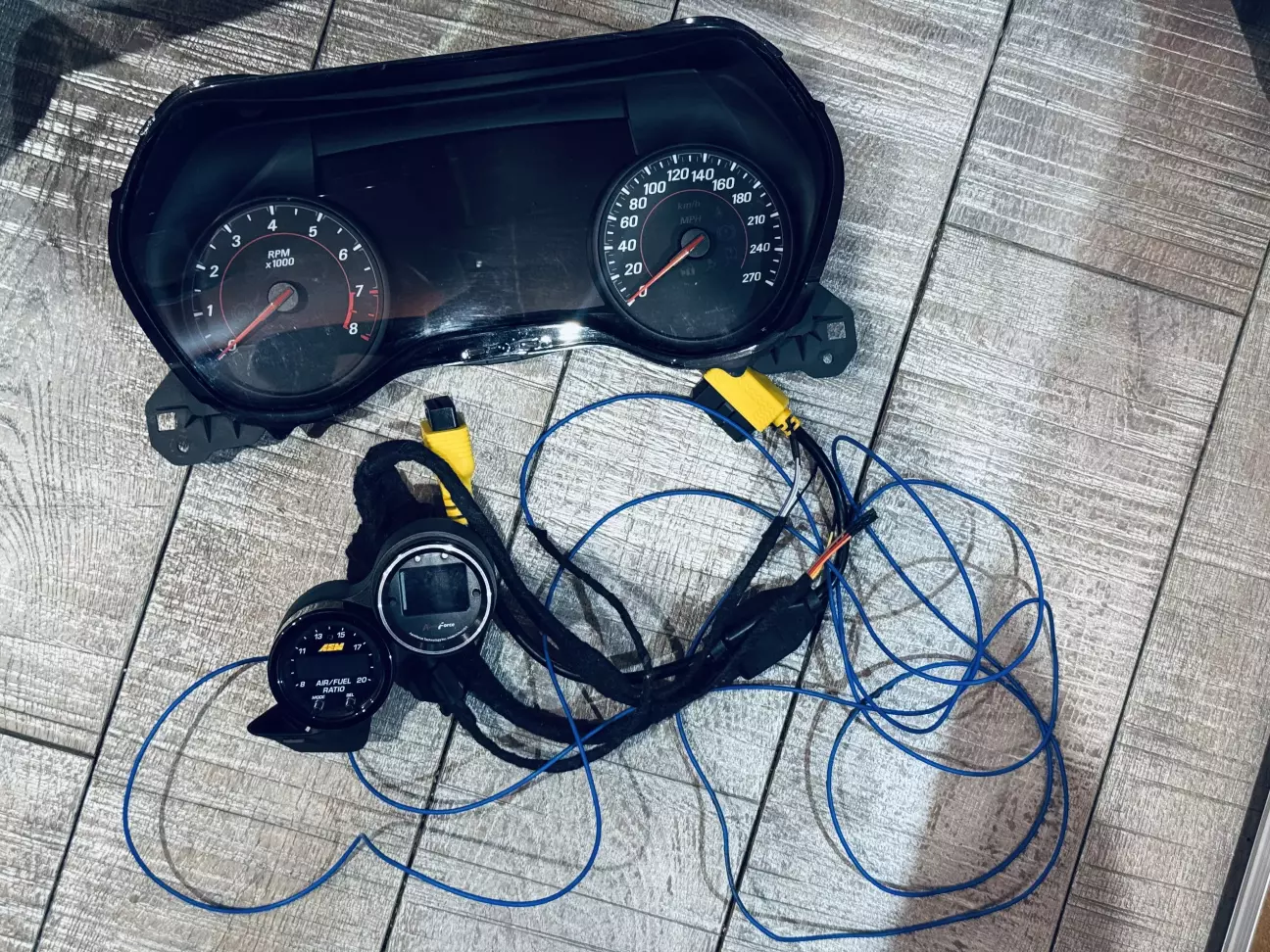 Отже, зустрічайте: приборка з великим екраном (з правильним тахометром від 2.0 і розміткою в кілометрах!) та прилади Aeroforce (як на моєму сліпері) і AEM, який показує коефіцієнт надлишку повітря. Косу проводки для датчиків зробив, цей набір буде встановлюватись одночасно, як буде час і натхнення, яких зовсім нема.