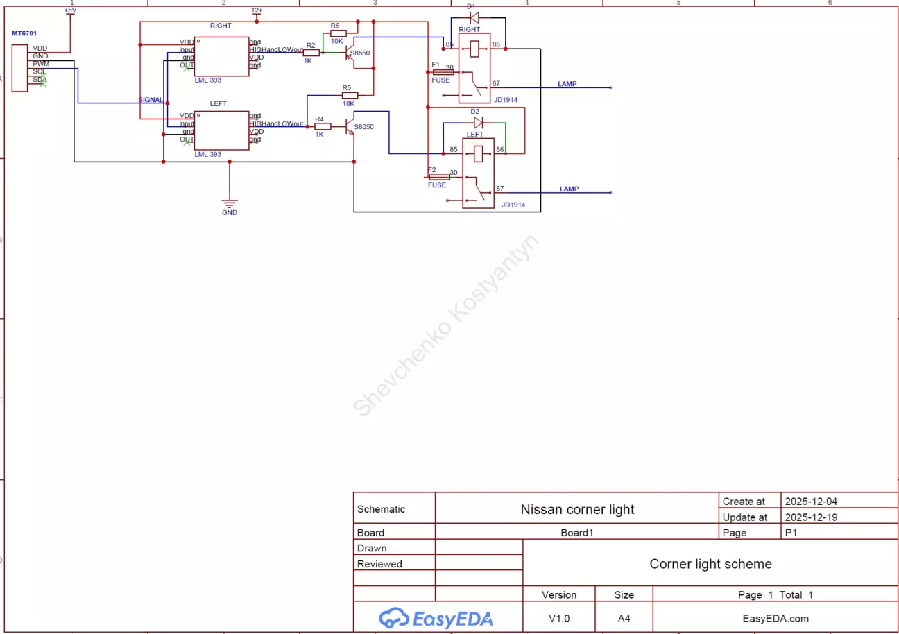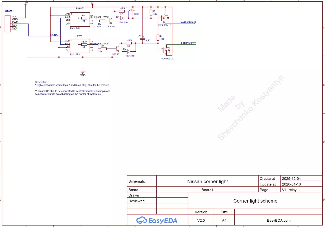 Магніт в свою чергу на відстані 3мм показує магнітному енкодеру в якому положенні знаходиться, магнітний енкодер в залежності від положення магніта або збільшує сигнальну напругу, або зменшує (в межах 5В) сигнал йде на 2 компаратора, це пристрої які при досягненні лімітного порогу живлення від енкодера подають на щось щось напругу ( в нашому випадку транзистори). далі йшли звичайні транзистори дзеркальних типів, з яких сигнал через резистори підтяжки вже йшов на реле які вмикались в залежності від повороту керма.