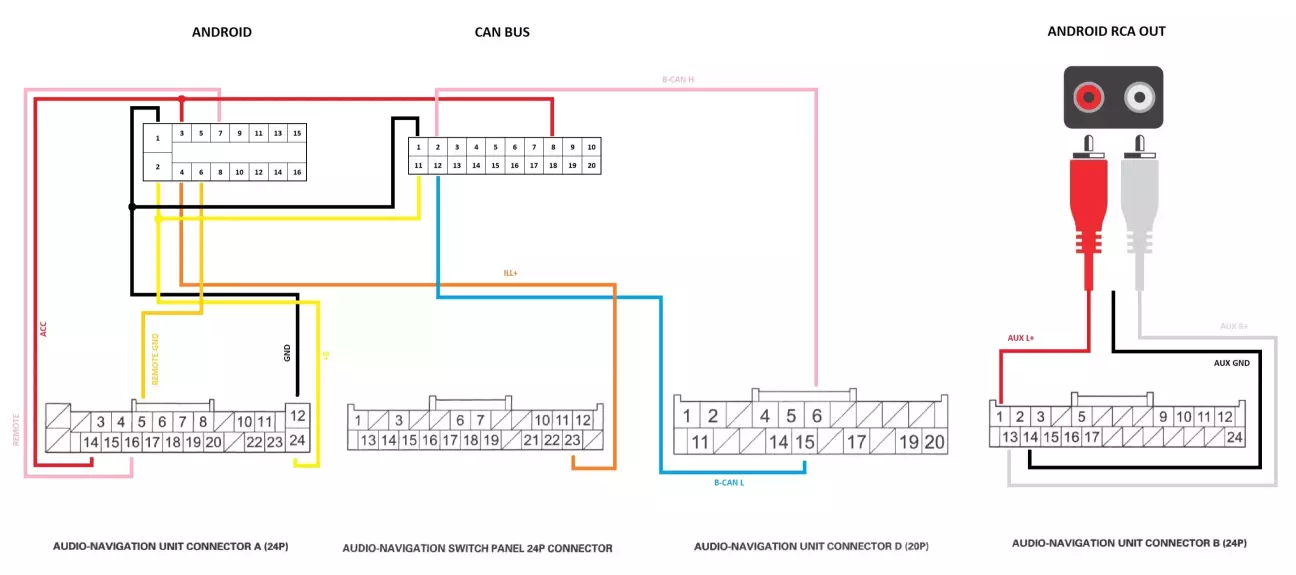 Фішка B(24P) являється джерелом аудіо сигналу від андроїда до штатки, в моєму випадку тимчасовим, для входу AUX на ГП/навігаційній панелі