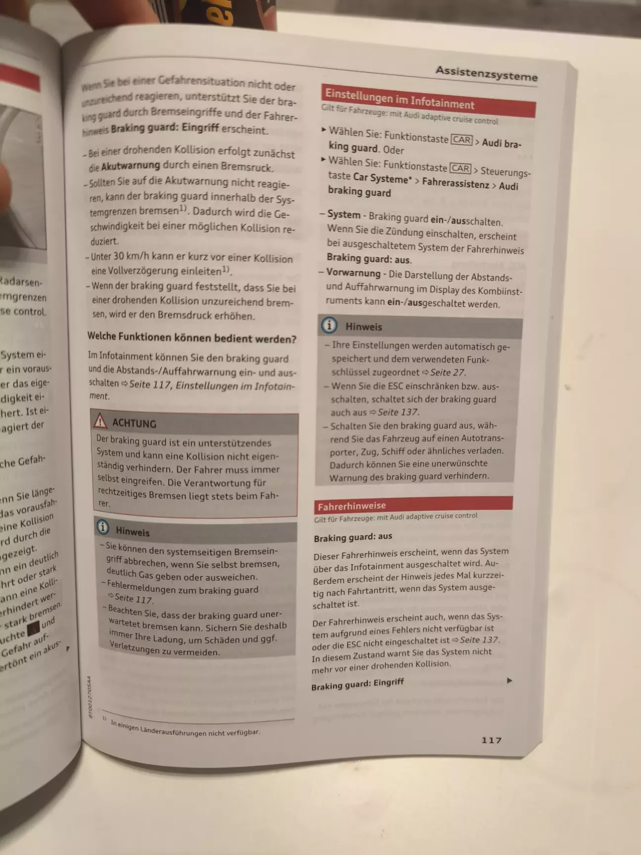 Audi Braking Guard функционирует совместно с другими системами активной безопасности автомобиля, включая ABS, ESP и адаптивный круиз‑контроль (если установлен), и предназначена исключительно для поддержки водителя в критических ситуациях.