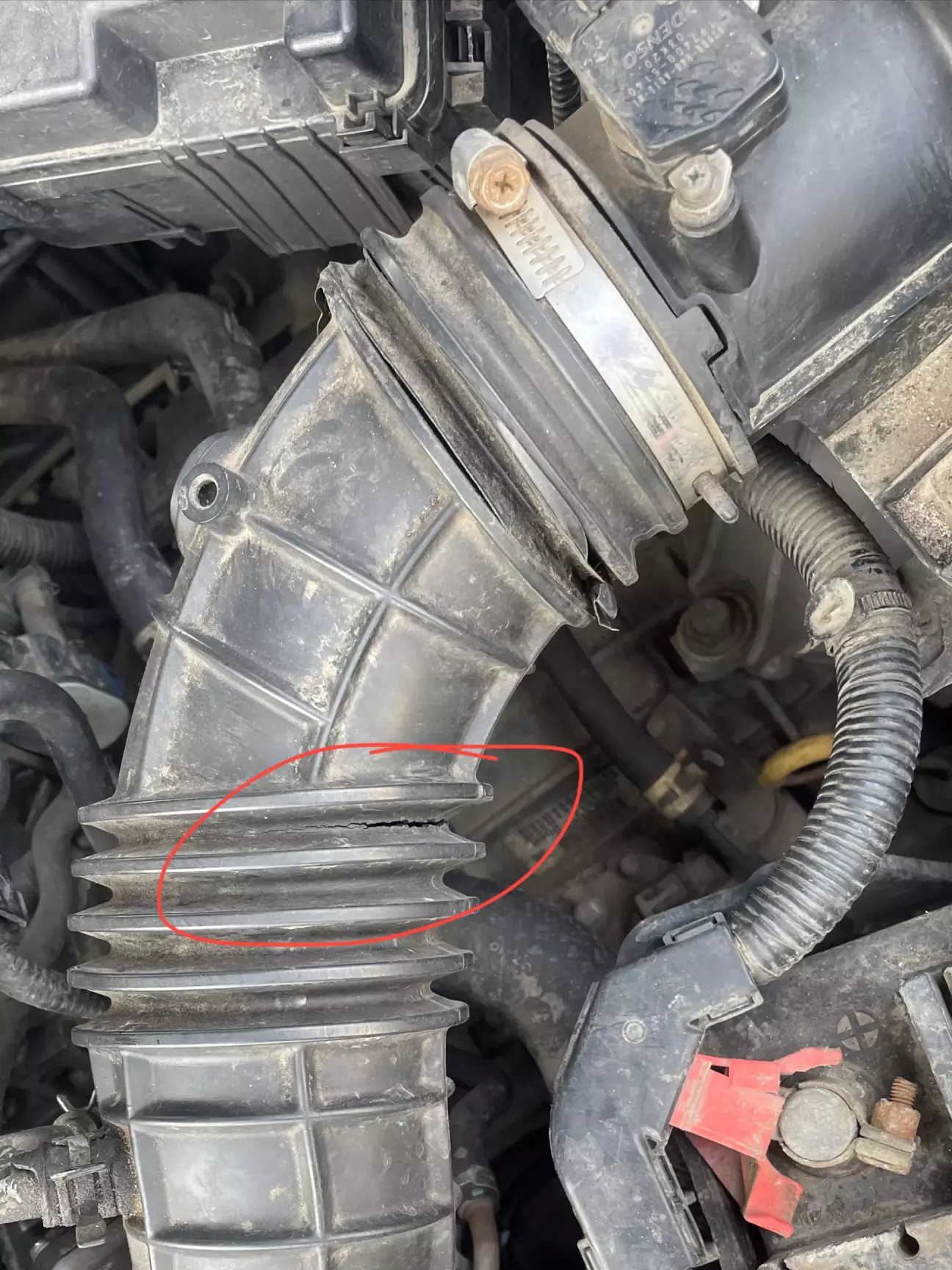 При заміні повітряного фільтру помітив тріщину на впускному патрубку. Можливо, я і став її причиною, бо міняв фільтр без відʼєднання патрубку, а просто відвівши його в сторону. Але справа не в тому. Помітив, що частина патрубка просто замотана ізолентою. Жесть.