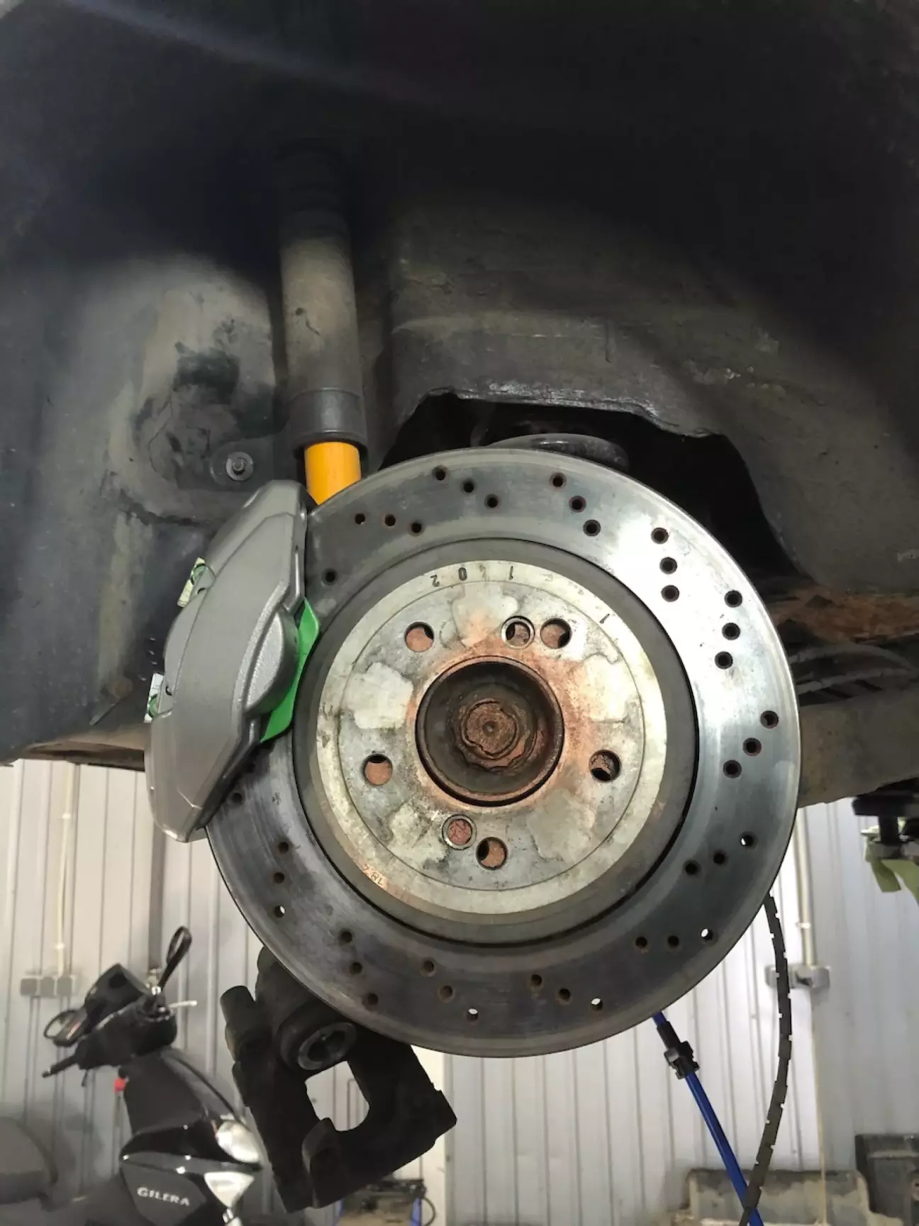 Ще є 2 нюанси - 1. маленький болт кріплення заднього м3 диска не співпадає з отвором ступиці. 2. треба було трохи болгаркою підточити колодки передніх гальм зі сторони внутрішнього радіусу, щоб було більше кліренсу до шапки диска. (воно і так було норм - кліренс в 1мм. Але я хотів перестрахуватись - зробив 2.5мм)
