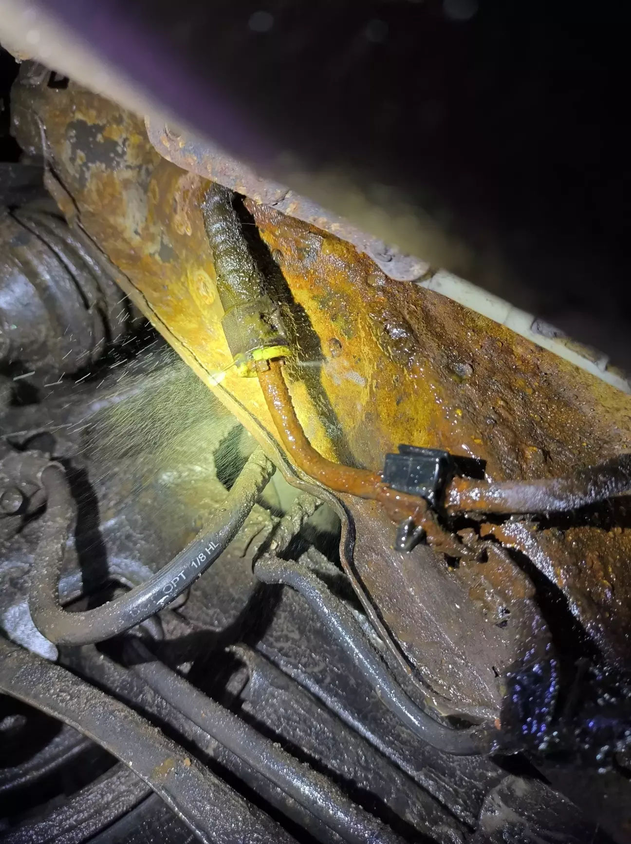 Почув запах бензину біля авто, думав що з сусіднього, але він не зник. Заїхав на яму - тече паливна трубка на подачу палива, в місці з'єднання поліпропілену і мідної трубки, але тече саме з мідної.