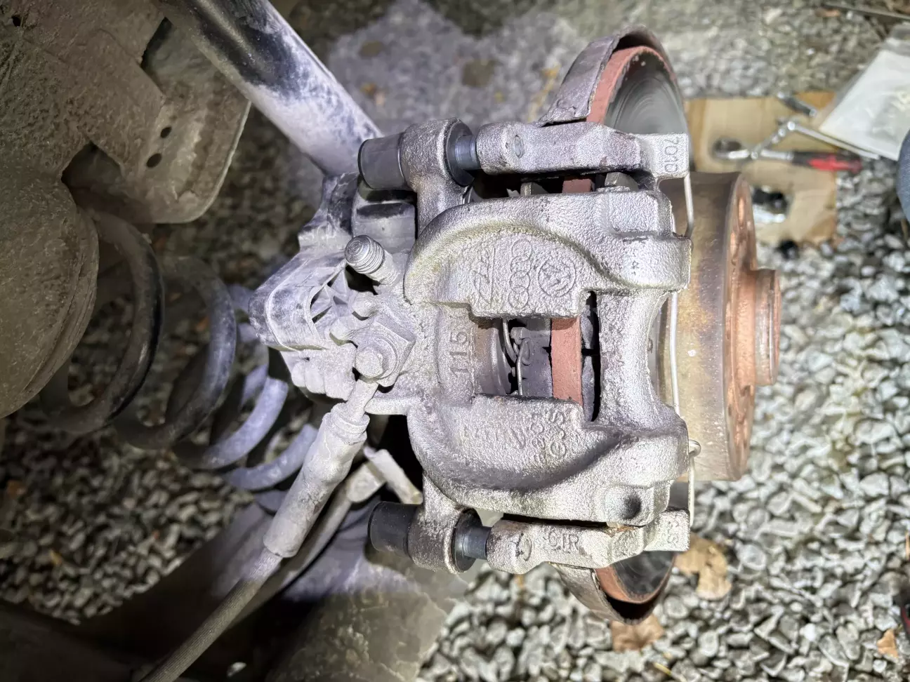 Одного дня почув запах паленого від заднього лівого колеса, заклинив задній лівий суппорт, колодки перегрівалися і воняли. Морозного ранку -15, замінив направляючі, поставив загублену пружинку, розробив ТЦ. Запчастини брав ті що бистріше дешевше і в наявності. Для цих процедур, тотожно заміні колодок, необхідно розвести ел. ручник в сервісний режим. Для цього купив CarScannerPro (моб. застосунок) за 10 дол. І в пару кліків розвів і звів все що треба.