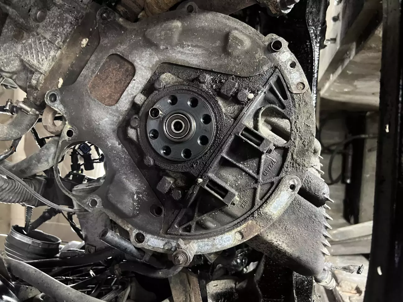 Далі я зняв корзину, диск щеплення. Відкрутив маховик і побачив таку картину