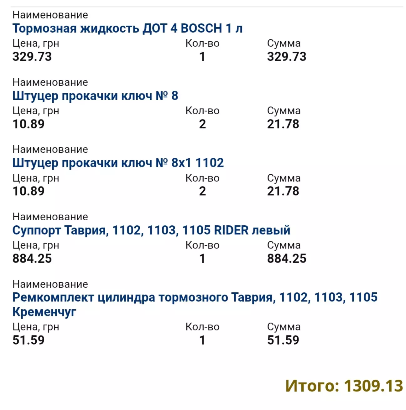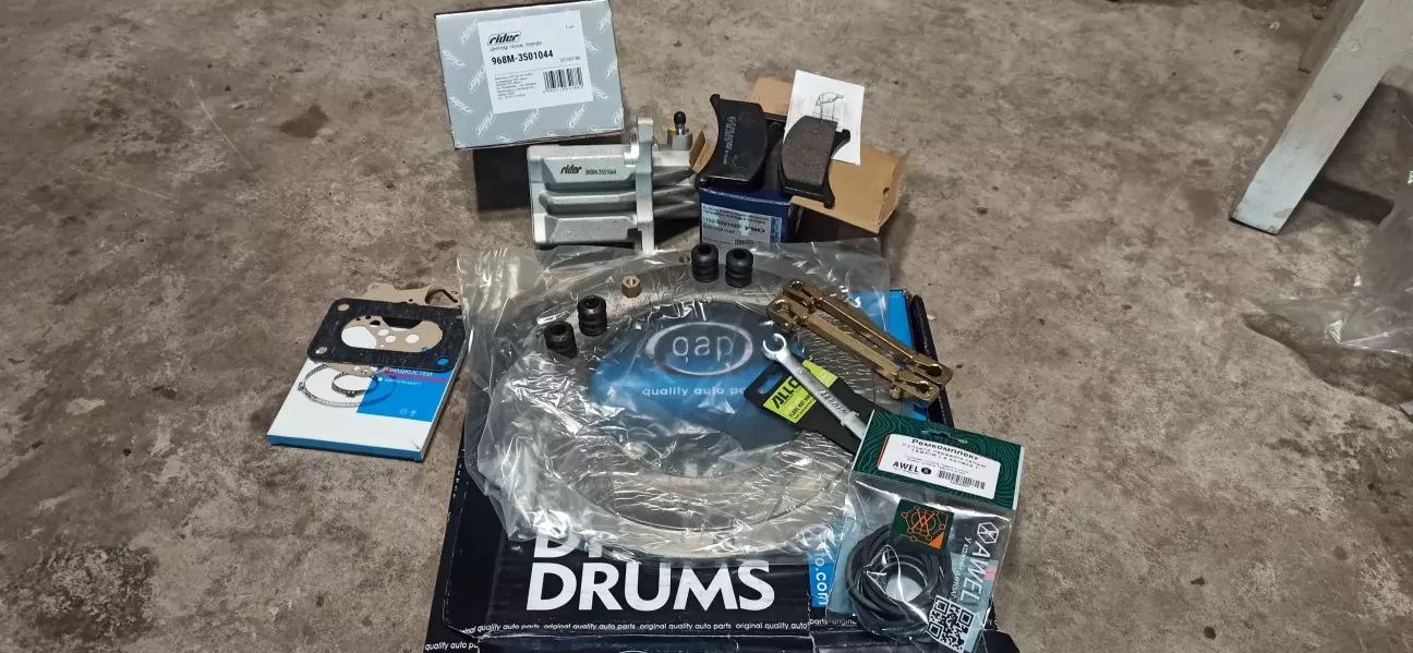 Замовив пару гальмівних дисків, комплект колодок, та комплект пильовиків направляючих супорта, тут же купив ремкомплект суппорта(на всяк випадок), гальмівну рідину, ключі для відкручування штуцерів, та трохи іншого.