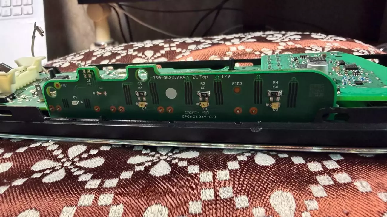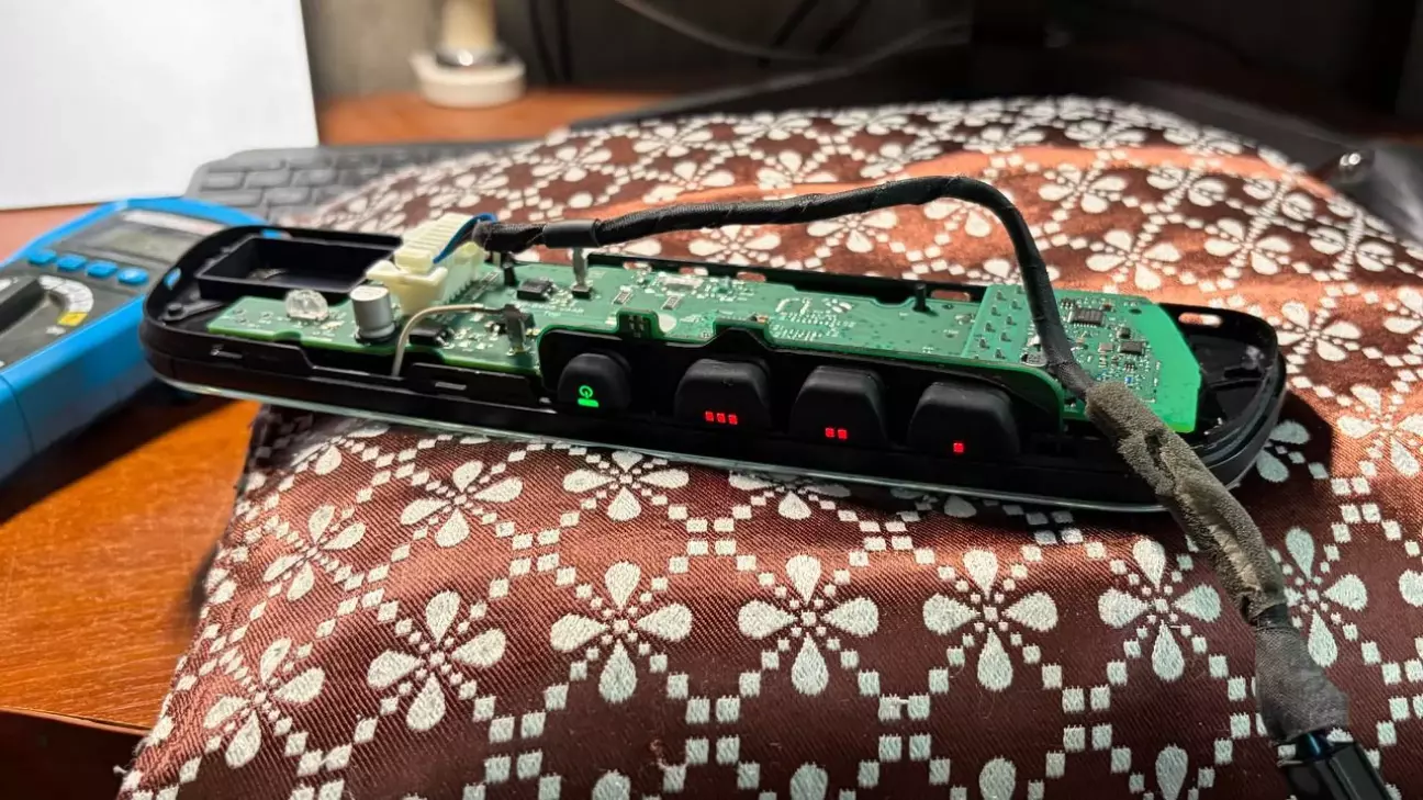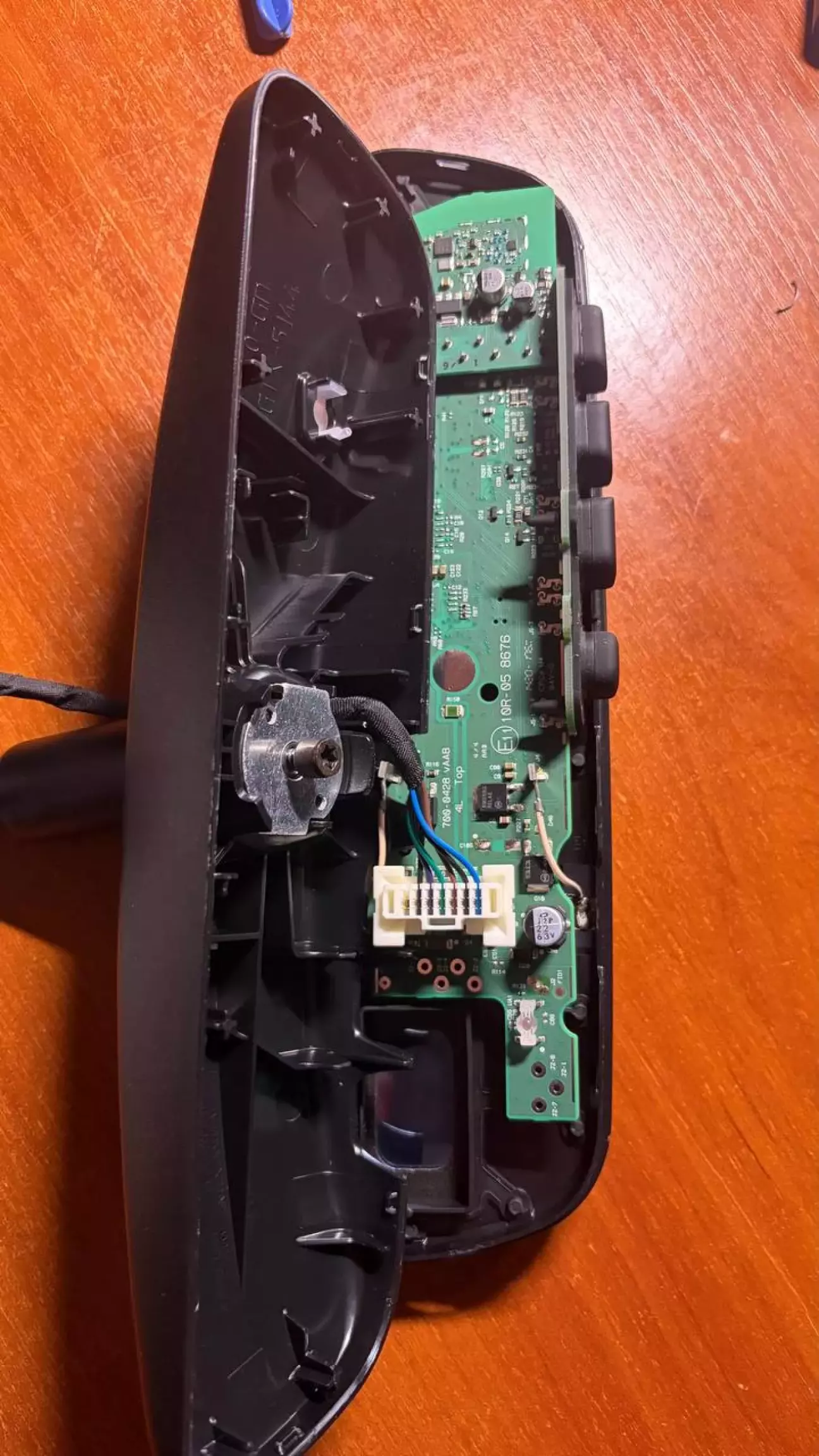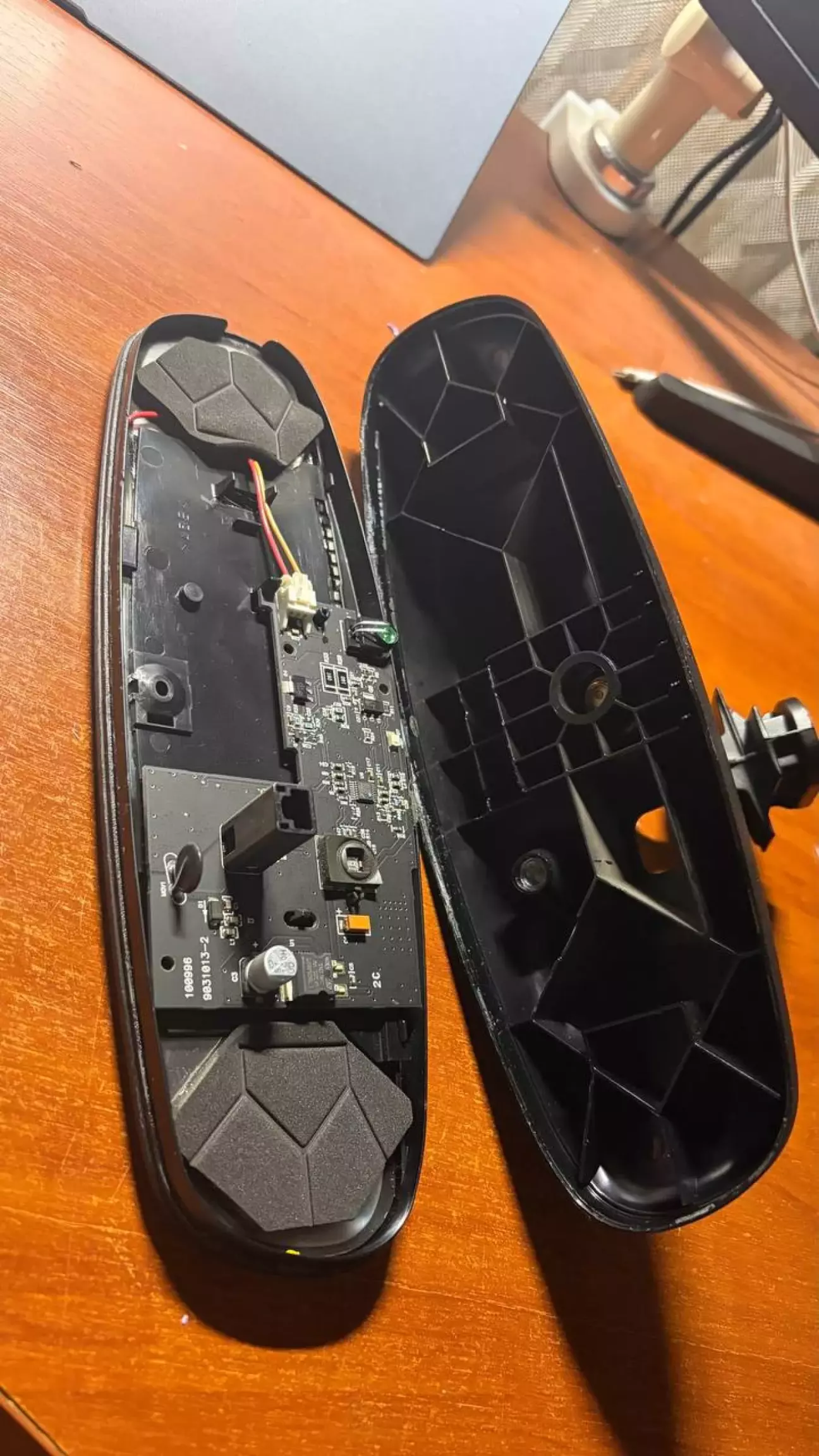 Роздивляючись розібране дзеркало, помітив поржні місця для світлодіодів підсвітки кнопок Homelink, одразу вирішив їх туди додати. окрім діодів там не вистачало ще деталей, трохи порукожопив і підсвітка запрацювала, вмикається із запаленням