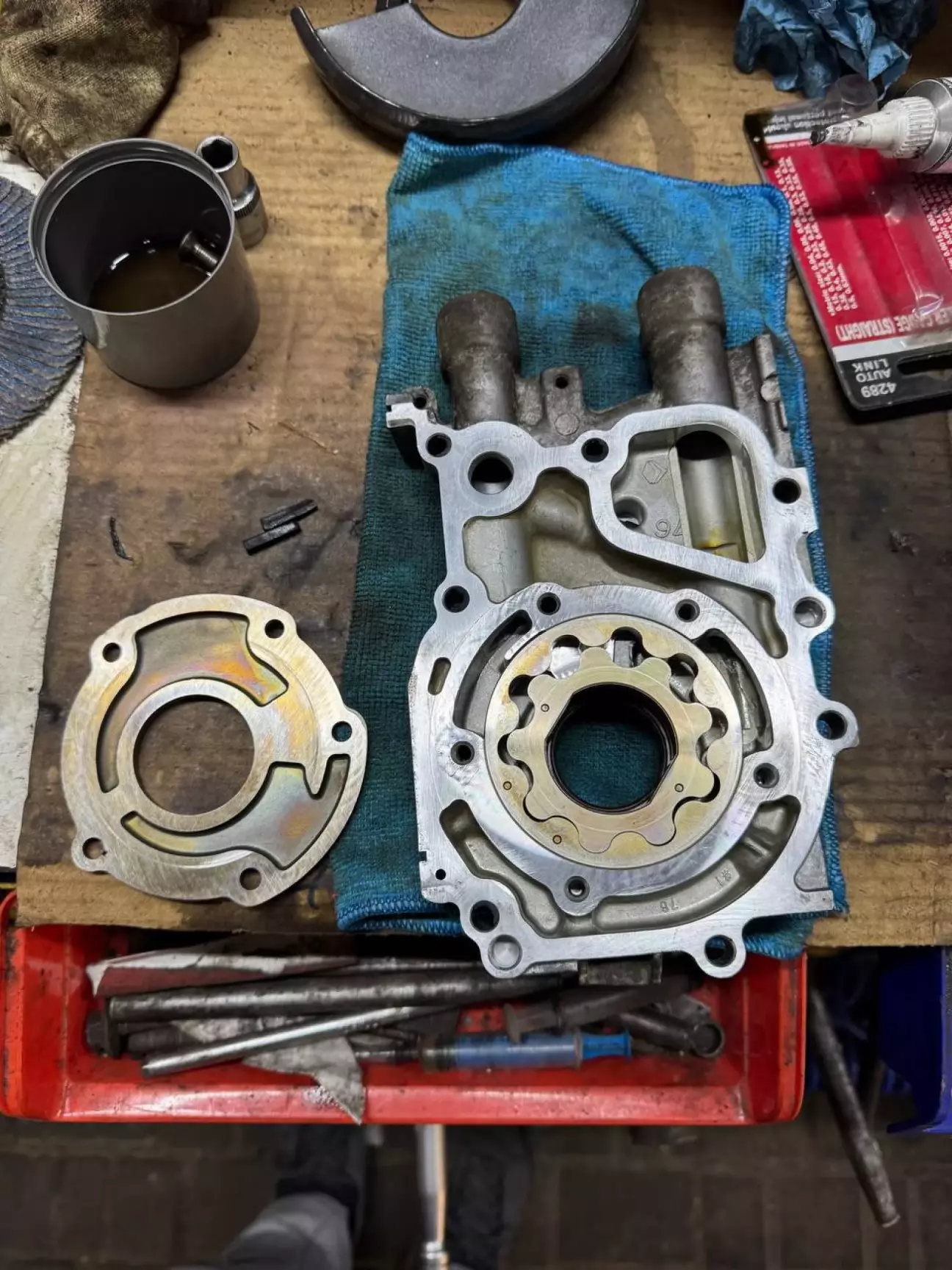 Паралельно з ГРМ заліз у масляний насос — є інформація, що там можуть відкручуватися внутрішні болти. Так і сталося: один болт справді був послаблений. Посадив болти на синій фіксатор різьби та все надійно затягнув. Також замінив передній сальник колінвала та гумове ущільнення між блоком і маслонасосом.