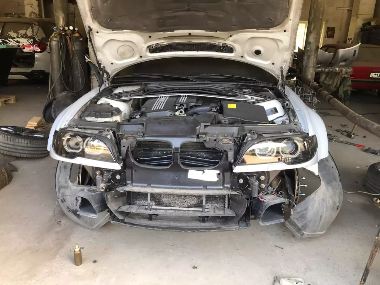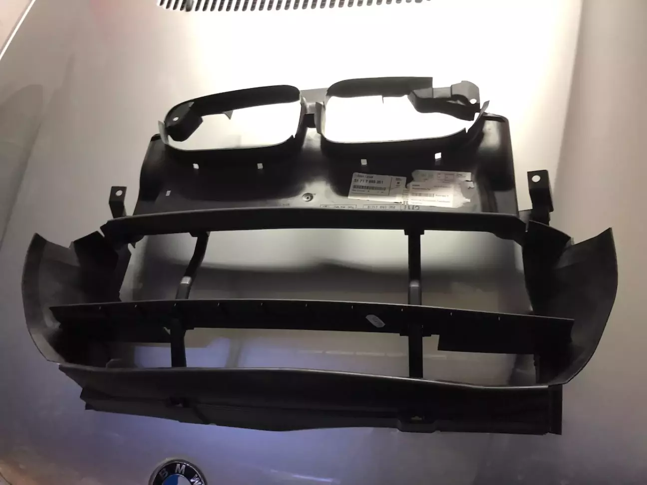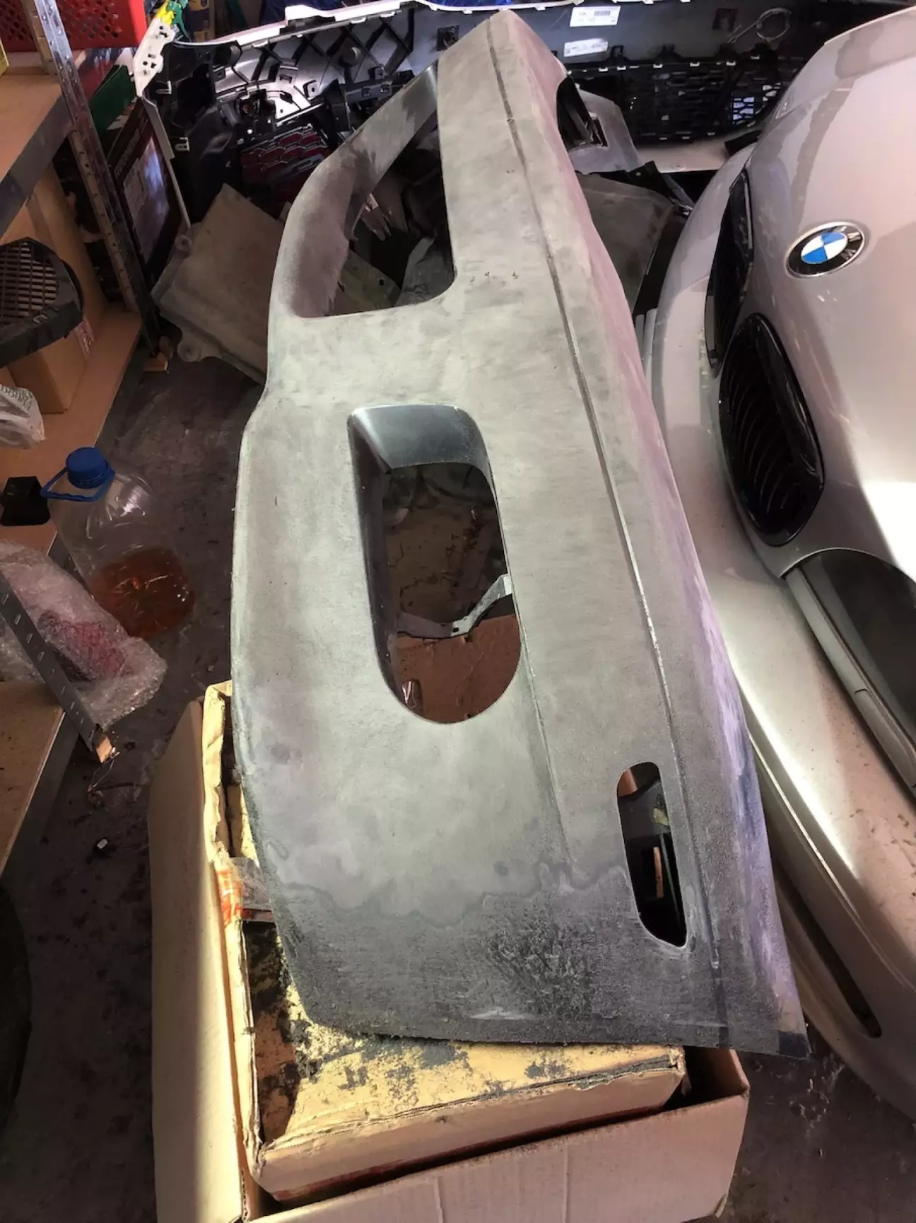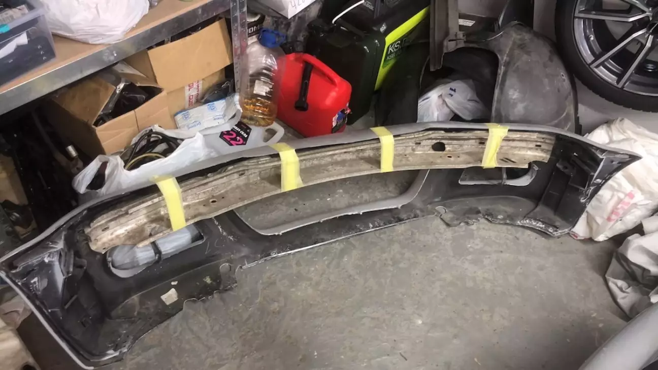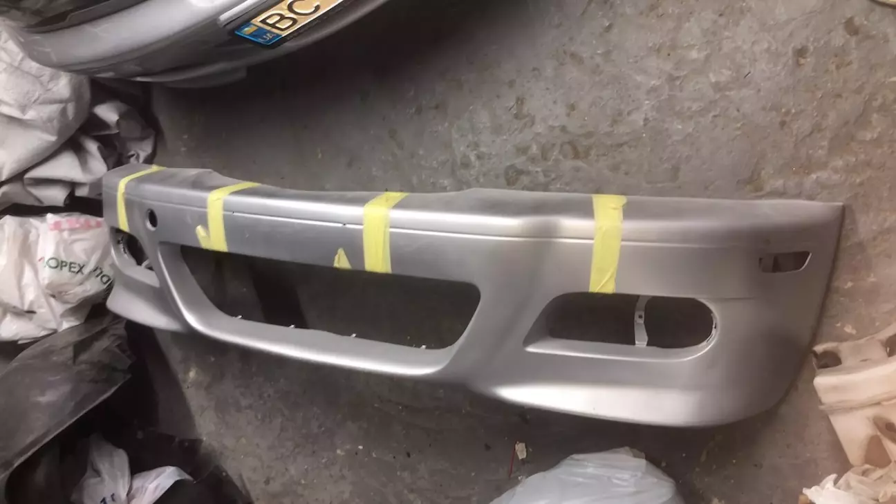 Далі цілком випадково попався оригінальний м3 бампер. Дорестовий, що важливо. В дуже поганому стані зовнішньо. Він був з якоїсь машини яка виступала в гонках і весь заклеєний лівреєю. Я її відклеїв, а товстезний шар клею лишився на бампері. Він просто в'ївся в пластик. Довелось все знімати до голого пластику шкуркою