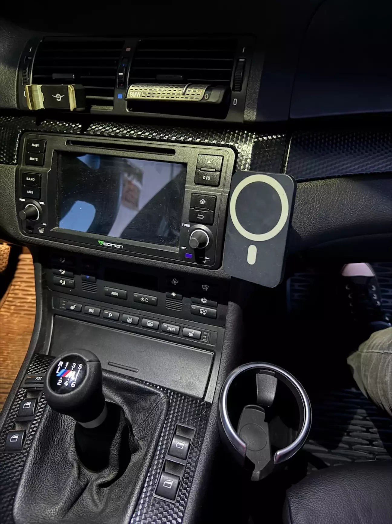 Я знаю про оригінальні телефонні подіуми для e46 які кріпляться справа від консолі. Але по перше - в мене там вже підстаканник, а по друге - а ви б поставили ТАКЕ на свій авто?