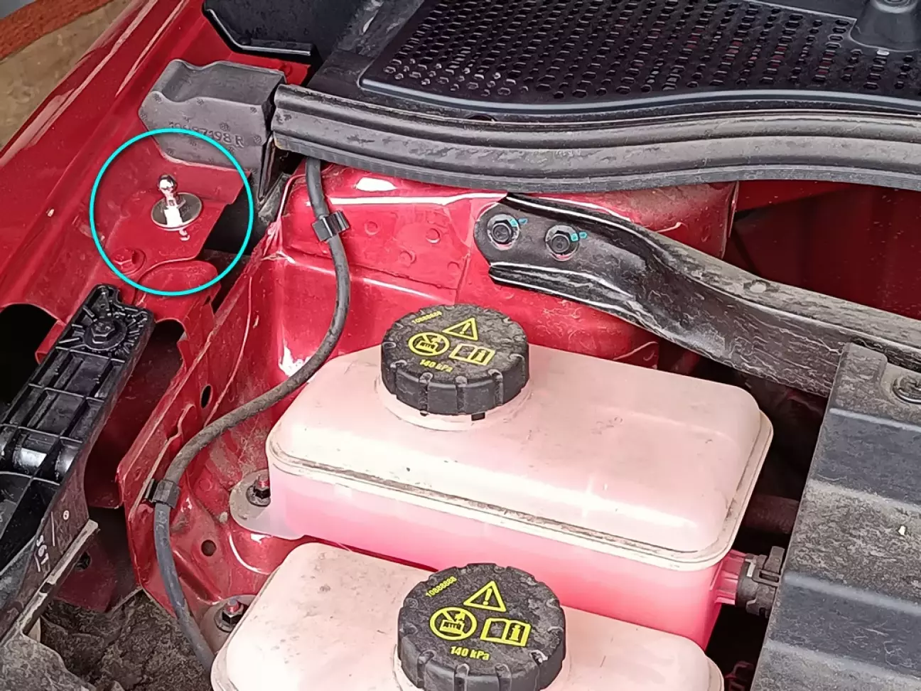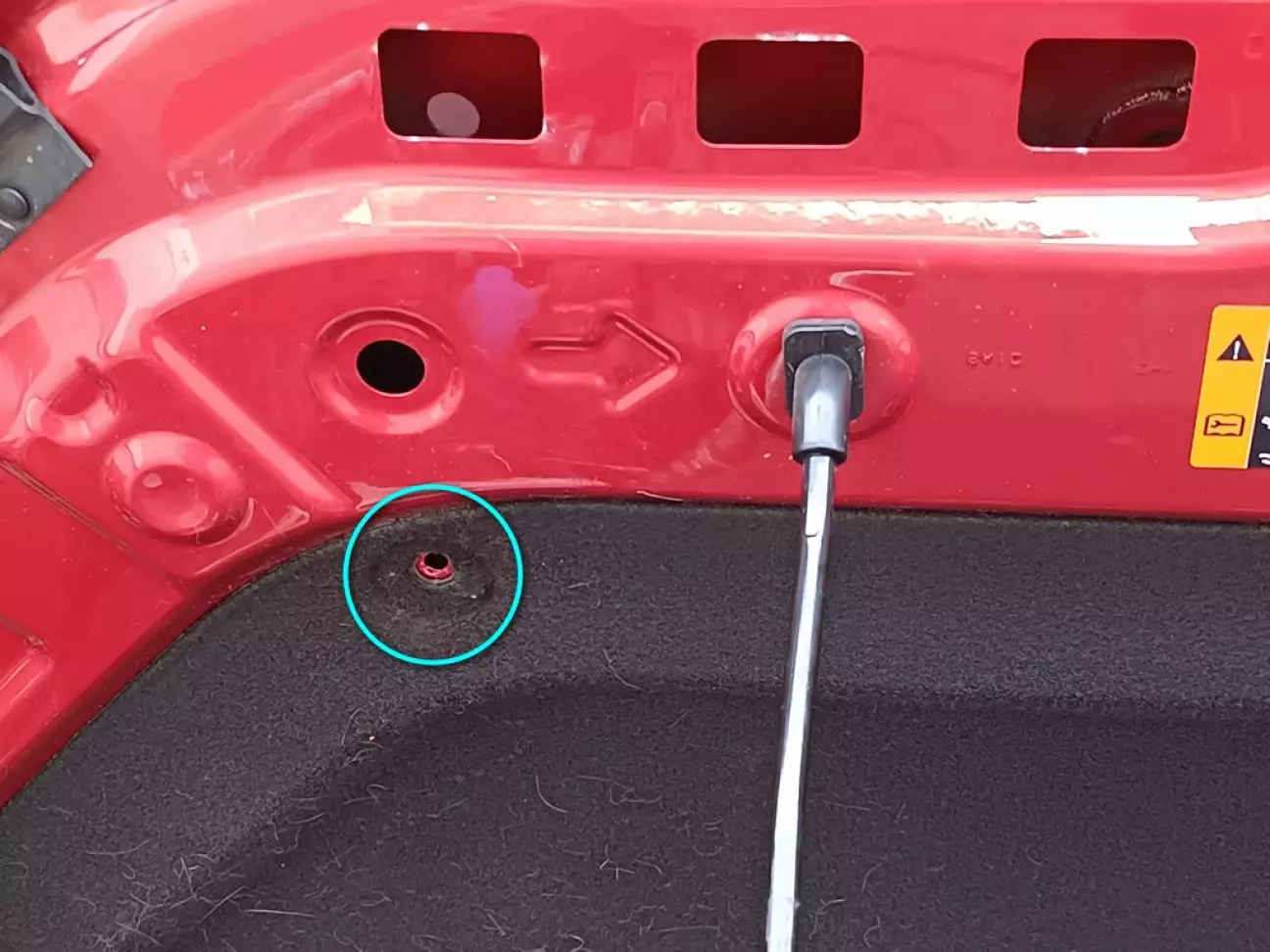 И дальше интересный момент: через те самые большие отверстия, в полость капота заводится гайка на поводке из металлической ленты. Ленту можно подогнуть как удобно, проблем с этим не возникает.